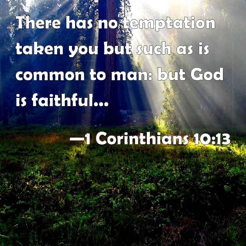 Choose a Background 1 Corinthians 10:13 There has no temptation taken you but such as is common to man: but God is faithful, who will not suffer you to be tempted above that you are able; but will with the temptation also make a way to escape, that you may be able to bear it. KJV: There hath no temptation taken you but such as is common to man: but God is faithful, who will not suffer you to be tempted above that ye are able; but will with the temptation also make a way to escape, that ye may be able to bear it. DRB: Let no temptation take hold on you, but such as is human. And God is faithful, who will not suffer you to be tempted above that which you are able: but will make also with temptation issue, that you may be able to bear it. DBT: No temptation has taken you but such as is according to man's nature; and God is faithful, who will not suffer you to be tempted above what ye are able to bear, but will with the temptation make the issue also, so that ye should be able to bear it. ERV: There hath no temptation taken you but such as man can bear: but God is faithful, who will not suffer you to be tempted above that ye are able; but will with the temptation make also the way of escape, that ye may be able to endure it. WBT: There hath no temptation taken you but such as is common to man: but God is faithful, who will not suffer you to be tempted above what ye are able; but will with the temptation also make a way to escape, that ye may be able to bear it. WEB: No temptation has taken you except what is common to man. God is faithful, who will not allow you to be tempted above what you are able, but will with the temptation also make the way of escape, that you may be able to endure it. YLT: No temptation hath taken you — except human; and God is faithful, who will not suffer you to be tempted above what ye are able, but He will make, with the temptation, also the outlet, for your being able to bear it.Links 1 Corinthians 10:13 NIV • 1 Corinthians 10:13 NLT • 1 Corinthians 10:13 ESV • 1 Corinthians 10:13 NASB • 1 Corinthians 10:13 KJV • 1 Corinthians 10:13 Interlinear • 1 Corinthians 10:13 Commentaries • 1 Corinthians 10:13 Parallel Texts • 1 Corinthians 10:13 Bible Apps • 1 Corinthians 10:13 Parallel • Bible Hub |