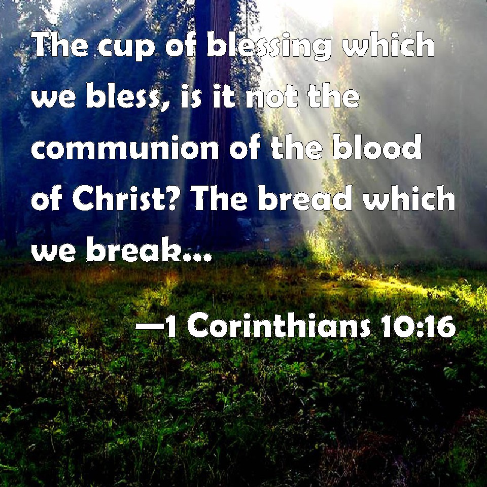 Choose a Background 1 Corinthians 10:16 The cup of blessing which we bless, is it not the communion of the blood of Christ? The bread which we break, is it not the communion of the body of Christ? KJV: The cup of blessing which we bless, is it not the communion of the blood of Christ? The bread which we break, is it not the communion of the body of Christ? DRB: The chalice of benediction, which we bless, is it not the communion of the blood of Christ ? And the bread, which we break, is it not the partaking of the body of the Lord ? DBT: The cup of blessing which we bless, is it not the communion of the blood of the Christ? The bread which we break, is it not the communion of the body of the Christ? ERV: The cup of blessing which we bless, is it not a communion of the blood of Christ? The bread which we break, is it not a communion of the body of Christ? WBT: The cup of blessing which we bless, is it not the communion of the blood of Christ? The bread which we break, is it not the communion of the body of Christ? WEB: The cup of blessing which we bless, isn't it a sharing of the blood of Christ? The bread which we break, isn't it a sharing of the body of Christ? YLT: The cup of the blessing that we bless — is it not the fellowship of the blood of the Christ? the bread that we break — is it not the fellowship of the body of the Christ?Links 1 Corinthians 10:16 NIV • 1 Corinthians 10:16 NLT • 1 Corinthians 10:16 ESV • 1 Corinthians 10:16 NASB • 1 Corinthians 10:16 KJV • 1 Corinthians 10:16 Interlinear • 1 Corinthians 10:16 Commentaries • 1 Corinthians 10:16 Parallel Texts • 1 Corinthians 10:16 Bible Apps • 1 Corinthians 10:16 Parallel • Bible Hub |