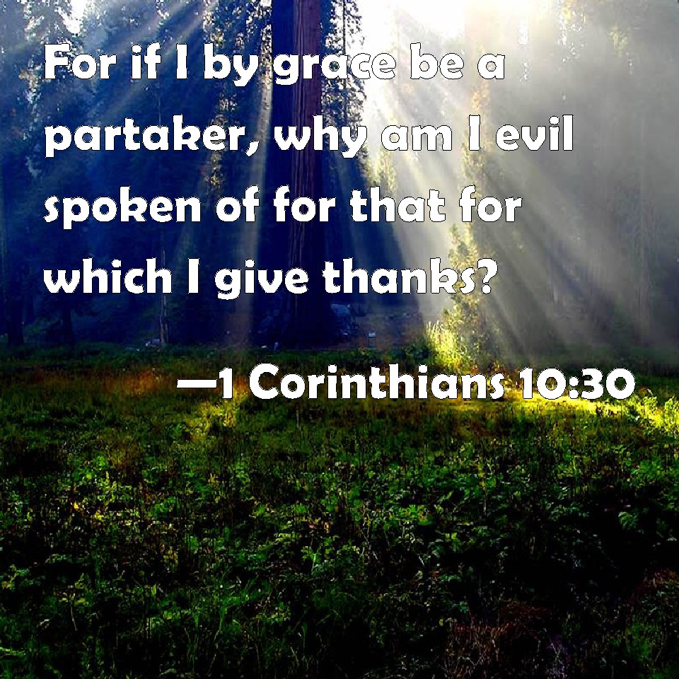 Choose a Background 1 Corinthians 10:30 For if I by grace be a partaker, why am I evil spoken of for that for which I give thanks? KJV: For if I by grace be a partaker, why am I evil spoken of for that for which I give thanks? DRB: If I partake with thanksgiving, why am I evil spoken of, for that for which I give thanks ? DBT: If I partake with thanksgiving, why am I spoken evil of for what I give thanks for? ERV: If I by grace partake, why am I evil spoken of for that for which I give thanks? WBT: For if I by grace am a partaker, why am I evil spoken of for that for which I give thanks? WEB: If I partake with thankfulness, why am I denounced for that for which I give thanks? YLT: and if I thankfully do partake, why am I evil spoken of, for that for which I give thanks?Links 1 Corinthians 10:30 NIV • 1 Corinthians 10:30 NLT • 1 Corinthians 10:30 ESV • 1 Corinthians 10:30 NASB • 1 Corinthians 10:30 KJV • 1 Corinthians 10:30 Interlinear • 1 Corinthians 10:30 Commentaries • 1 Corinthians 10:30 Parallel Texts • 1 Corinthians 10:30 Bible Apps • 1 Corinthians 10:30 Parallel • Bible Hub |
