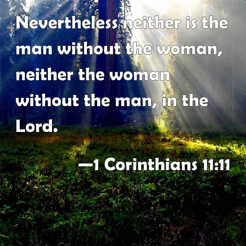 Choose a Background 1 Corinthians 11:11 Nevertheless neither is the man without the woman, neither the woman without the man, in the Lord. KJV: Nevertheless neither is the man without the woman, neither the woman without the man, in the Lord. DRB: But yet neither is the man without the woman, nor the woman without the man, in the Lord. DBT: However, neither is woman without man, nor man without woman, in the Lord. ERV: Howbeit neither is the woman without the man, nor the man without the woman, in the Lord. WBT: Nevertheless, neither is the man without the woman, neither the woman without the man in the Lord. WEB: Nevertheless, neither is the woman independent of the man, nor the man independent of the woman, in the Lord. YLT: but neither is a man apart from a woman, nor a woman apart from a man, in the Lord,Links 1 Corinthians 11:11 NIV • 1 Corinthians 11:11 NLT • 1 Corinthians 11:11 ESV • 1 Corinthians 11:11 NASB • 1 Corinthians 11:11 KJV • 1 Corinthians 11:11 Interlinear • 1 Corinthians 11:11 Commentaries • 1 Corinthians 11:11 Parallel Texts • 1 Corinthians 11:11 Bible Apps • 1 Corinthians 11:11 Parallel • Bible Hub |