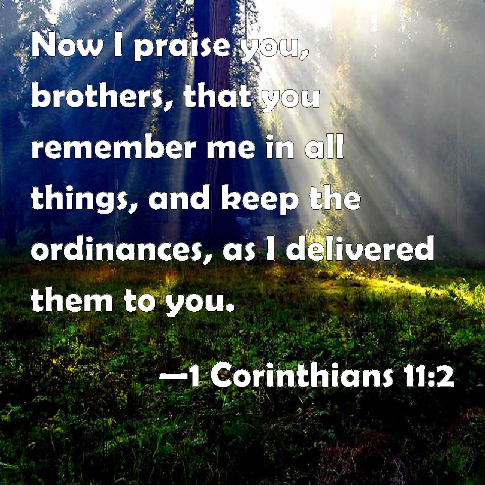 Choose a Background 1 Corinthians 11:2 Now I praise you, brothers, that you remember me in all things, and keep the ordinances, as I delivered them to you. KJV: Now I praise you, brethren, that ye remember me in all things, and keep the ordinances, as I delivered them to you. DRB: Now I praise you, brethren, that in all things you are mindful of me: and keep my ordinances as I have delivered them to you. DBT: Now I praise you, that in all things ye are mindful of me; and that as I have directed you, ye keep the directions. ERV: Now I praise you that ye remember me in all things, and hold fast the traditions, even as I delivered them to you. WBT: Now I praise you, brethren, that ye remember me in all things, and keep the ordinances, as I delivered them to you. WEB: Now I praise you, brothers, that you remember me in all things, and hold firm the traditions, even as I delivered them to you. YLT: And I praise you, brethren, that in all things ye remember me, and according as I did deliver to you, the deliverances ye keep,Links 1 Corinthians 11:2 NIV • 1 Corinthians 11:2 NLT • 1 Corinthians 11:2 ESV • 1 Corinthians 11:2 NASB • 1 Corinthians 11:2 KJV • 1 Corinthians 11:2 Interlinear • 1 Corinthians 11:2 Commentaries • 1 Corinthians 11:2 Parallel Texts • 1 Corinthians 11:2 Bible Apps • 1 Corinthians 11:2 Parallel • Bible Hub |