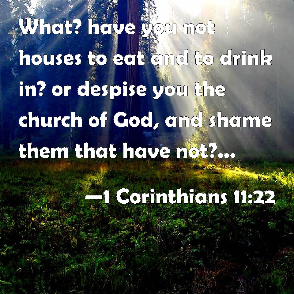 Choose a Background 1 Corinthians 11:22 What? have you not houses to eat and to drink in? or despise you the church of God, and shame them that have not? What shall I say to you? shall I praise you in this? I praise you not. KJV: What? have ye not houses to eat and to drink in? or despise ye the church of God, and shame them that have not? What shall I say to you? shall I praise you in this? I praise you not. DRB: What, have you not houses to eat and to drink in? Or despise ye the church of God; and put them to shame that have not ? What shall I say to you? Do I praise you? In this I praise you not. DBT: Have ye not then houses for eating and drinking? or do ye despise the assembly of God, and put to shame them who have not? What shall I say to you? shall I praise you? In this point I do not praise. ERV: What? have ye not houses to eat and to drink in? or despise ye the church of God, and put them to shame that have not? What shall I say to you? shall I praise you in this? I praise you not. WBT: What? have ye not houses to eat and to drink in? or despise ye the church of God, and shame them that have not? What shall I say to you? shall I praise you in this? I praise you not. WEB: What, don't you have houses to eat and to drink in? Or do you despise God's assembly, and put them to shame who don't have? What shall I tell you? Shall I praise you? In this I don't praise you. YLT: why, have ye not houses to eat and to drink in? or the assembly of God do ye despise, and shame those not having? what may I say to you? shall I praise you in this? I do not praise!Links 1 Corinthians 11:22 NIV • 1 Corinthians 11:22 NLT • 1 Corinthians 11:22 ESV • 1 Corinthians 11:22 NASB • 1 Corinthians 11:22 KJV • 1 Corinthians 11:22 Interlinear • 1 Corinthians 11:22 Commentaries • 1 Corinthians 11:22 Parallel Texts • 1 Corinthians 11:22 Bible Apps • 1 Corinthians 11:22 Parallel • Bible Hub |