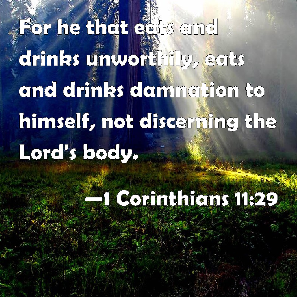 Choose a Background 1 Corinthians 11:29 For he that eats and drinks unworthily, eats and drinks damnation to himself, not discerning the Lord's body. KJV: For he that eateth and drinketh unworthily, eateth and drinketh damnation to himself, not discerning the Lord's body. DRB: For he that eateth and drinketh unworthily, eateth and drinketh judgment to himself, not discerning the body of the Lord. DBT: For the eater and drinker eats and drinks judgment to himself, not distinguishing the body. ERV: For he that eateth and drinketh, eateth and drinketh judgment unto himself, if he discern not the body. WBT: For he that eateth and drinketh unworthily, eateth and drinketh condemnation to himself, not discerning the Lord's body. WEB: For he who eats and drinks in an unworthy way eats and drinks judgment to himself, if he doesn't discern the Lord's body. YLT: for he who is eating and drinking unworthily, judgment to himself he doth eat and drink — not discerning the body of the Lord.Links 1 Corinthians 11:29 NIV • 1 Corinthians 11:29 NLT • 1 Corinthians 11:29 ESV • 1 Corinthians 11:29 NASB • 1 Corinthians 11:29 KJV • 1 Corinthians 11:29 Interlinear • 1 Corinthians 11:29 Commentaries • 1 Corinthians 11:29 Parallel Texts • 1 Corinthians 11:29 Bible Apps • 1 Corinthians 11:29 Parallel • Bible Hub |