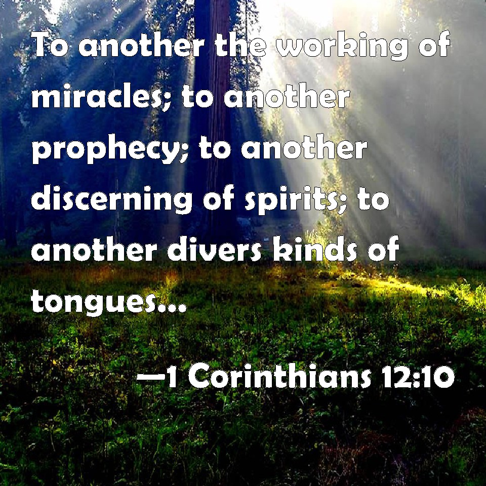 Choose a Background 1 Corinthians 12:10 To another the working of miracles; to another prophecy; to another discerning of spirits; to another divers kinds of tongues; to another the interpretation of tongues: KJV: To another the working of miracles; to another prophecy; to another discerning of spirits; to another divers kinds of tongues; to another the interpretation of tongues: DRB: To another, the working of miracles; to another, prophecy; to another, the discerning of spirits; to another, diverse kinds of tongues; to another, interpretation of speeches. DBT: and to another operations of miracles; and to another prophecy; and to another discerning of spirits; and to a different one kinds of tongues; and to another interpretation of tongues. ERV: and to another workings of miracles; and to another prophecy; and to another discernings of spirits: to another divers kinds of tongues; and to another the interpretation of tongues: WBT: To another, the working of miracles; to another, prophecy; to another, discerning of spirits; to another, divers kinds of languages; to another, the interpretation of languages: WEB: and to another workings of miracles; and to another prophecy; and to another discerning of spirits; to another different kinds of languages; and to another the interpretation of languages. YLT: and to another in-workings of mighty deeds; and to another prophecy; and to another discernings of spirits; and to another divers kinds of tongues; and to another interpretation of tongues:Links 1 Corinthians 12:10 NIV • 1 Corinthians 12:10 NLT • 1 Corinthians 12:10 ESV • 1 Corinthians 12:10 NASB • 1 Corinthians 12:10 KJV • 1 Corinthians 12:10 Interlinear • 1 Corinthians 12:10 Commentaries • 1 Corinthians 12:10 Parallel Texts • 1 Corinthians 12:10 Bible Apps • 1 Corinthians 12:10 Parallel • Bible Hub |