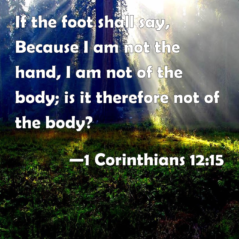 Choose a Background 1 Corinthians 12:15 If the foot shall say, Because I am not the hand, I am not of the body; is it therefore not of the body? KJV: If the foot shall say, Because I am not the hand, I am not of the body; is it therefore not of the body? DRB: If the foot should say, because I am not the hand, I am not of the body; is it therefore not of the body ? DBT: If the foot say, Because I am not a hand I am not of the body, is it on account of this not indeed of the body? ERV: If the foot shall say, Because I am not the hand, I am not of the body; it is not therefore not of the body. WBT: If the foot shall say, Because I am not the hand, I am not of the body; is it therefore not of the body? WEB: If the foot would say, "Because I'm not the hand, I'm not part of the body," it is not therefore not part of the body. YLT: if the foot may say, 'Because I am not a hand, I am not of the body;' it is not, because of this, not of the body;Links 1 Corinthians 12:15 NIV • 1 Corinthians 12:15 NLT • 1 Corinthians 12:15 ESV • 1 Corinthians 12:15 NASB • 1 Corinthians 12:15 KJV • 1 Corinthians 12:15 Interlinear • 1 Corinthians 12:15 Commentaries • 1 Corinthians 12:15 Parallel Texts • 1 Corinthians 12:15 Bible Apps • 1 Corinthians 12:15 Parallel • Bible Hub |