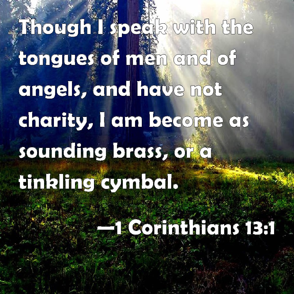 Choose a Background 1 Corinthians 13:1 Though I speak with the tongues of men and of angels, and have not charity, I am become as sounding brass, or a tinkling cymbal. KJV: Though I speak with the tongues of men and of angels, and have not charity, I am become as sounding brass, or a tinkling cymbal. DRB: IF I speak with the tongues of men, and of angels, and have not charity, I am become as sounding brass, or a tinkling cymbal. DBT: If I speak with the tongues of men and of angels, but have not love, I am become sounding brass or a clanging cymbal. ERV: If I speak with the tongues of men and of angels, but have not love, I am become sounding brass, or a clanging cymbal. WBT: Though I speak with the tongues of men and of angels, and have not charity, I am become as sounding brass, or a tinkling cymbal. WEB: If I speak with the languages of men and of angels, but don't have love, I have become sounding brass, or a clanging cymbal. YLT: If with the tongues of men and of messengers I speak, and have not love, I have become brass sounding, or a cymbal tinkling;Links 1 Corinthians 13:1 NIV • 1 Corinthians 13:1 NLT • 1 Corinthians 13:1 ESV • 1 Corinthians 13:1 NASB • 1 Corinthians 13:1 KJV • 1 Corinthians 13:1 Interlinear • 1 Corinthians 13:1 Commentaries • 1 Corinthians 13:1 Parallel Texts • 1 Corinthians 13:1 Bible Apps • 1 Corinthians 13:1 Parallel • Bible Hub |