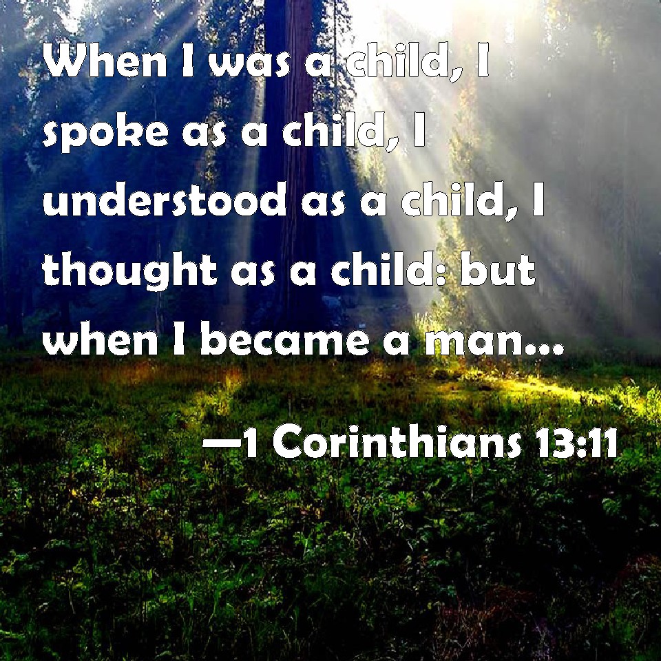 Choose a Background 1 Corinthians 13:11 When I was a child, I spoke as a child, I understood as a child, I thought as a child: but when I became a man, I put away childish things. KJV: When I was a child, I spake as a child, I understood as a child, I thought as a child: but when I became a man, I put away childish things. DRB: When I was a child, I spoke as a child, I understood as a child, I thought as a child. But, when I became a man, I put away the things of a child. DBT: When I was a child, I spoke as a child, I felt as a child, I reasoned as a child; when I became a man, I had done with what belonged to the child. ERV: When I was a child, I spake as a child, I felt as a child, I thought as a child: now that I am become a man, I have put away childish things. WBT: When I was a child, I spoke as a child, I understood as a child, I thought as a child: but when I became a man, I put away childish things. WEB: When I was a child, I spoke as a child, I felt as a child, I thought as a child. Now that I have become a man, I have put away childish things. YLT: When I was a babe, as a babe I was speaking, as a babe I was thinking, as a babe I was reasoning, and when I have become a man, I have made useless the things of the babe;Links 1 Corinthians 13:11 NIV • 1 Corinthians 13:11 NLT • 1 Corinthians 13:11 ESV • 1 Corinthians 13:11 NASB • 1 Corinthians 13:11 KJV • 1 Corinthians 13:11 Interlinear • 1 Corinthians 13:11 Commentaries • 1 Corinthians 13:11 Parallel Texts • 1 Corinthians 13:11 Bible Apps • 1 Corinthians 13:11 Parallel • Bible Hub |