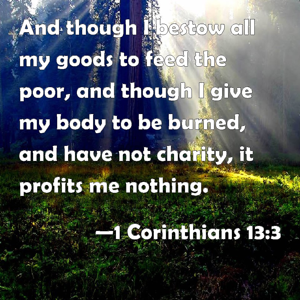 Choose a Background 1 Corinthians 13:3 And though I bestow all my goods to feed the poor, and though I give my body to be burned, and have not charity, it profits me nothing. KJV: And though I bestow all my goods to feed the poor, and though I give my body to be burned, and have not charity, it profiteth me nothing. DRB: And if I should distribute all my goods to feed the poor, and if I should deliver my body to be burned, and have not charity, it profiteth me nothing. DBT: And if I shall dole out all my goods in food, and if I deliver up my body that I may be burned, but have not love, I profit nothing. ERV: And if I bestow all my goods to feed the poor, and if I give my body to be burned, but have not love, it profiteth me nothing. WBT: And though I bestow all my goods to feed the poor, and though I give my body to be burned, and have not charity, it profiteth me nothing. WEB: If I dole out all my goods to feed the poor, and if I give my body to be burned, but don't have love, it profits me nothing. YLT: and if I give away to feed others all my goods, and if I give up my body that I may be burned, and have not love, I am profited nothing.Links 1 Corinthians 13:3 NIV • 1 Corinthians 13:3 NLT • 1 Corinthians 13:3 ESV • 1 Corinthians 13:3 NASB • 1 Corinthians 13:3 KJV • 1 Corinthians 13:3 Interlinear • 1 Corinthians 13:3 Commentaries • 1 Corinthians 13:3 Parallel Texts • 1 Corinthians 13:3 Bible Apps • 1 Corinthians 13:3 Parallel • Bible Hub |