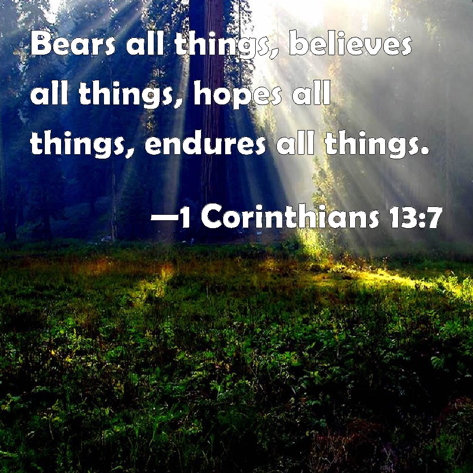 Choose a Background 1 Corinthians 13:7 Bears all things, believes all things, hopes all things, endures all things. KJV: Beareth all things, believeth all things, hopeth all things, endureth all things. DRB: Beareth all things, believeth all things, hopeth all things, endureth all things. DBT: bears all things, believes all things, hopes all things, endures all things. ERV: beareth all things, believeth all things, hopeth all things, endureth all things. WBT: Beareth all things, believeth all things, hopeth all things, endureth all things. WEB: bears all things, believes all things, hopes all things, endures all things. YLT: all things it beareth, all it believeth, all it hopeth, all it endureth.Links 1 Corinthians 13:7 NIV • 1 Corinthians 13:7 NLT • 1 Corinthians 13:7 ESV • 1 Corinthians 13:7 NASB • 1 Corinthians 13:7 KJV • 1 Corinthians 13:7 Interlinear • 1 Corinthians 13:7 Commentaries • 1 Corinthians 13:7 Parallel Texts • 1 Corinthians 13:7 Bible Apps • 1 Corinthians 13:7 Parallel • Bible Hub |
