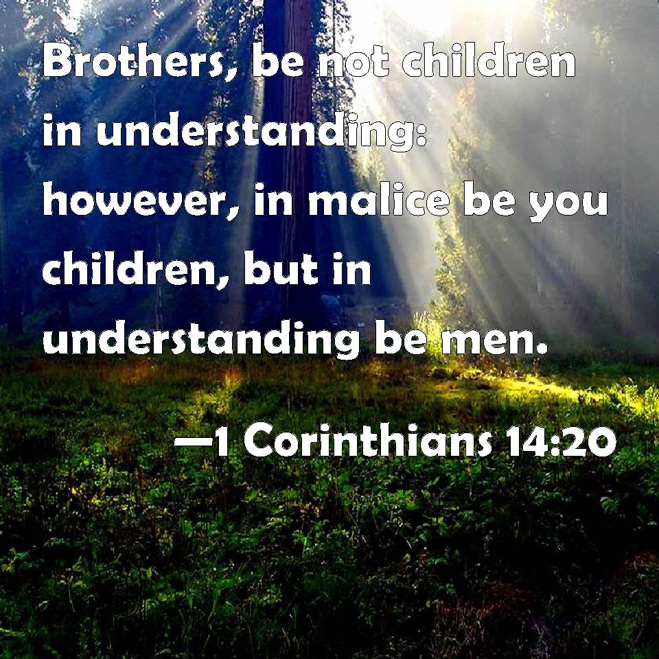 Choose a Background 1 Corinthians 14:20 Brothers, be not children in understanding: however, in malice be you children, but in understanding be men. KJV: Brethren, be not children in understanding: howbeit in malice be ye children, but in understanding be men. DRB: Brethren, do not become children in sense: but in malice be children, and in sense be perfect. DBT: Brethren, be not children in your minds, but in malice be babes; but in your minds be grown men. ERV: Brethren, be not children in mind: howbeit in malice be ye babes, but in mind be men. WBT: Brethren, be not children in understanding: yet in malice be ye children, but in understanding be men. WEB: Brothers, don't be children in thoughts, yet in malice be babies, but in thoughts be mature. YLT: Brethren, become not children in the understanding, but in the evil be ye babes, and in the understanding become ye perfect;Links 1 Corinthians 14:20 NIV • 1 Corinthians 14:20 NLT • 1 Corinthians 14:20 ESV • 1 Corinthians 14:20 NASB • 1 Corinthians 14:20 KJV • 1 Corinthians 14:20 Interlinear • 1 Corinthians 14:20 Commentaries • 1 Corinthians 14:20 Parallel Texts • 1 Corinthians 14:20 Bible Apps • 1 Corinthians 14:20 Parallel • Bible Hub |