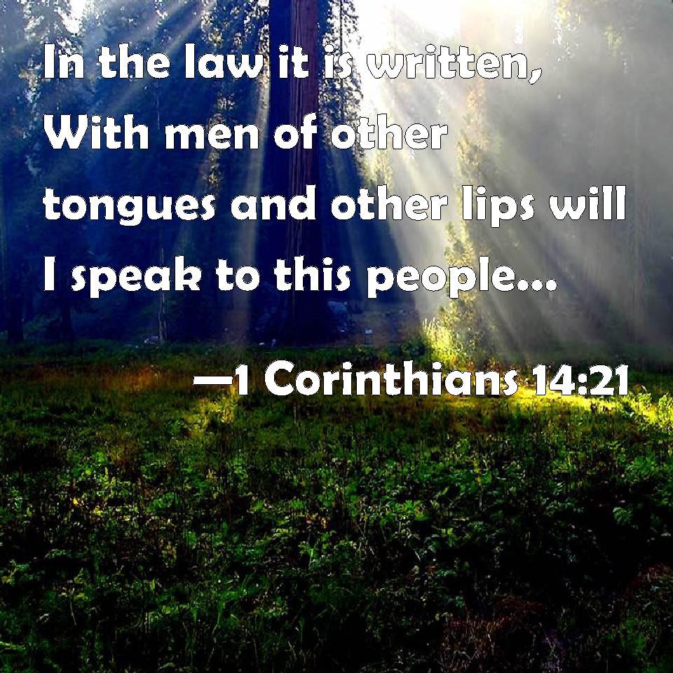 Choose a Background 1 Corinthians 14:21 In the law it is written, With men of other tongues and other lips will I speak to this people; and yet for all that will they not hear me, said the LORD. KJV: In the law it is written, With men of other tongues and other lips will I speak unto this people; and yet for all that will they not hear me, saith the Lord. DRB: In the law it is written: In other tongues and other lips I will speak to this people; and neither so will they hear me, saith the Lord. DBT: It is written in the law, By people of other tongues, and by strange lips, will I speak to this people; and neither thus will they hear me, saith the Lord. ERV: In the law it is written, By men of strange tongues and by the lips of strangers will I speak unto this people; and not even thus will they hear me, saith the Lord. WBT: In the law it is written, With men of other tongues and other lips will I speak to this people; and yet for all that will they not hear me, saith the Lord. WEB: In the law it is written, "By men of strange languages and by the lips of strangers I will speak to this people. Not even thus will they hear me, says the Lord." YLT: in the law it hath been written, that, 'With other tongues and with other lips I will speak to this people, and not even so will they hear Me, saith the Lord;'Links 1 Corinthians 14:21 NIV • 1 Corinthians 14:21 NLT • 1 Corinthians 14:21 ESV • 1 Corinthians 14:21 NASB • 1 Corinthians 14:21 KJV • 1 Corinthians 14:21 Interlinear • 1 Corinthians 14:21 Commentaries • 1 Corinthians 14:21 Parallel Texts • 1 Corinthians 14:21 Bible Apps • 1 Corinthians 14:21 Parallel • Bible Hub |