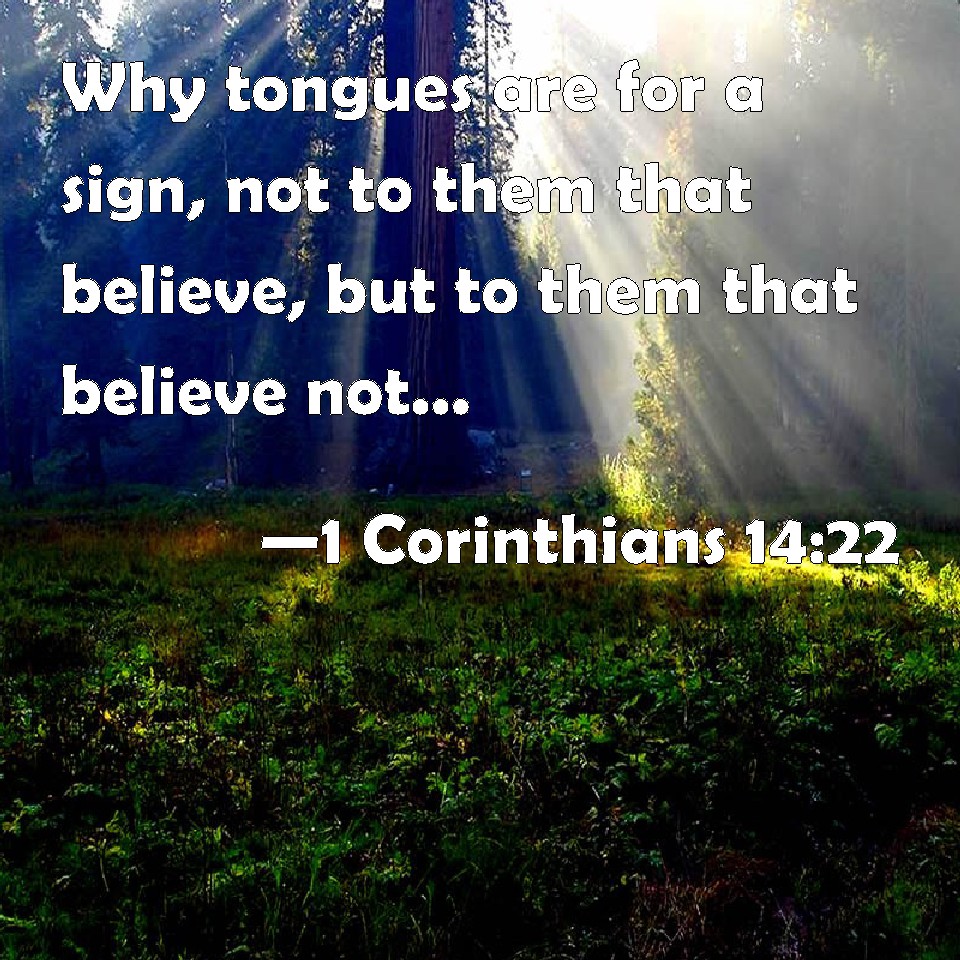 Choose a Background 1 Corinthians 14:22 Why tongues are for a sign, not to them that believe, but to them that believe not: but prophesying serves not for them that believe not, but for them which believe. KJV: Wherefore tongues are for a sign, not to them that believe, but to them that believe not: but prophesying serveth not for them that believe not, but for them which believe. DRB: Wherefore tongues are for a sign, not to believers, but to unbelievers; but prophecies not to unbelievers, but to believers. DBT: So that tongues are for a sign, not to those who believe, but to unbelievers; but prophecy, not to unbelievers, but to those who believe. ERV: Wherefore tongues are for a sign, not to them that believe, but to the unbelieving: but prophesying is for a sign, not to the unbelieving, but to them that believe. WBT: Wherefore languages are for a sign, not to them that believe, but to them that believe not: but prophesying serveth not for them that believe not, but for them who believe. WEB: Therefore other languages are for a sign, not to those who believe, but to the unbelieving; but prophesying is for a sign, not to the unbelieving, but to those who believe. YLT: so that the tongues are for a sign, not to the believing, but to the unbelieving; and the prophesy is not for the unbelieving, but for the believing,Links 1 Corinthians 14:22 NIV • 1 Corinthians 14:22 NLT • 1 Corinthians 14:22 ESV • 1 Corinthians 14:22 NASB • 1 Corinthians 14:22 KJV • 1 Corinthians 14:22 Interlinear • 1 Corinthians 14:22 Commentaries • 1 Corinthians 14:22 Parallel Texts • 1 Corinthians 14:22 Bible Apps • 1 Corinthians 14:22 Parallel • Bible Hub |