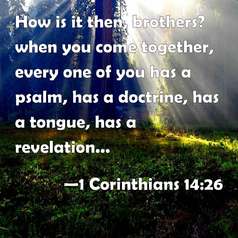 Choose a Background 1 Corinthians 14:26 How is it then, brothers? when you come together, every one of you has a psalm, has a doctrine, has a tongue, has a revelation, has an interpretation. Let all things be done to edifying. KJV: How is it then, brethren? when ye come together, every one of you hath a psalm, hath a doctrine, hath a tongue, hath a revelation, hath an interpretation. Let all things be done unto edifying. DRB: How is it then, brethren ? When you come together, every one of you hath a psalm, hath a doctrine, hath a revelation, hath a tongue, hath an interpretation: let all things be done to edification. DBT: What is it then, brethren? whenever ye come together, each of you has a psalm, has a teaching, has a tongue, has a revelation, has an interpretation. Let all things be done to edification. ERV: What is it then, brethren? When ye come together, each one hath a psalm, hath a teaching, hath a revelation, hath a tongue, hath an interpretation. Let all things be done unto edifying. WBT: How is it then, brethren? when ye are assembled, every one of you hath a psalm, hath a doctrine, hath a language, hath a revelation, hath an interpretation. Let all things be done to edification. WEB: What is it then, brothers? When you come together, each one of you has a psalm, has a teaching, has a revelation, has another language, has an interpretation. Let all things be done to build each other up. YLT: What then is it, brethren? whenever ye may come together, each of you hath a psalm, hath a teaching, hath a tongue, hath a revelation, hath an interpretation? let all things be for building up;Links 1 Corinthians 14:26 NIV • 1 Corinthians 14:26 NLT • 1 Corinthians 14:26 ESV • 1 Corinthians 14:26 NASB • 1 Corinthians 14:26 KJV • 1 Corinthians 14:26 Interlinear • 1 Corinthians 14:26 Commentaries • 1 Corinthians 14:26 Parallel Texts • 1 Corinthians 14:26 Bible Apps • 1 Corinthians 14:26 Parallel • Bible Hub |