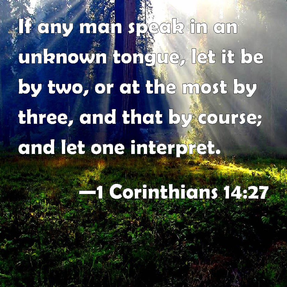Choose a Background 1 Corinthians 14:27 If any man speak in an unknown tongue, let it be by two, or at the most by three, and that by course; and let one interpret. KJV: If any man speak in an unknown tongue, let it be by two, or at the most by three, and that by course; and let one interpret. DRB: If any speak with a tongue, let it be by two, or at the most by three, and in course, and let one interpret. DBT: If any one speak with a tongue, let it be two, or at the most three, and separately, and let one interpret; ERV: If any man speaketh in a tongue, let it be by two, or at the most three, and that in turn; and let one interpret: WBT: If any man speaketh in an unknown language, let it be by two, or at the most by three, and that by course; and let one interpret. WEB: If any man speaks in another language, let it be two, or at the most three, and in turn; and let one interpret. YLT: if an unknown tongue any one do speak, by two, or at the most, by three, and in turn, and let one interpret;Links 1 Corinthians 14:27 NIV • 1 Corinthians 14:27 NLT • 1 Corinthians 14:27 ESV • 1 Corinthians 14:27 NASB • 1 Corinthians 14:27 KJV • 1 Corinthians 14:27 Interlinear • 1 Corinthians 14:27 Commentaries • 1 Corinthians 14:27 Parallel Texts • 1 Corinthians 14:27 Bible Apps • 1 Corinthians 14:27 Parallel • Bible Hub |