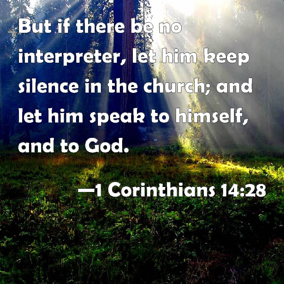 Choose a Background 1 Corinthians 14:28 But if there be no interpreter, let him keep silence in the church; and let him speak to himself, and to God. KJV: But if there be no interpreter, let him keep silence in the church; and let him speak to himself, and to God. DRB: But if there be no interpreter, let him hold his peace in the church, and speak to himself and to God. DBT: but if there be no interpreter, let him be silent in the assembly, and let him speak to himself and to God. ERV: but if there be no interpreter, let him keep silence in the church; and let him speak to himself, and to God. WBT: But if there is no interpreter, let him keep silence in the church; and let him speak to himself, and to God. WEB: But if there is no interpreter, let him keep silent in the assembly, and let him speak to himself, and to God. YLT: and if there may be no interpreter, let him be silent in an assembly, and to himself let him speak, and to God.Links 1 Corinthians 14:28 NIV • 1 Corinthians 14:28 NLT • 1 Corinthians 14:28 ESV • 1 Corinthians 14:28 NASB • 1 Corinthians 14:28 KJV • 1 Corinthians 14:28 Interlinear • 1 Corinthians 14:28 Commentaries • 1 Corinthians 14:28 Parallel Texts • 1 Corinthians 14:28 Bible Apps • 1 Corinthians 14:28 Parallel • Bible Hub |