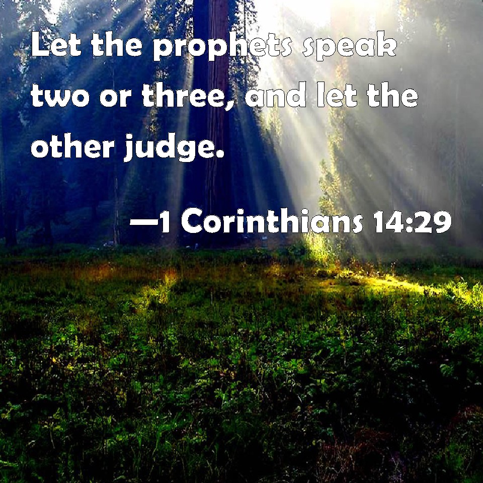 Choose a Background 1 Corinthians 14:29 Let the prophets speak two or three, and let the other judge. KJV: Let the prophets speak two or three, and let the other judge. DRB: And let the prophets speak, two or three; and let the rest judge. DBT: And let two or three prophets speak, and let the others judge. ERV: And let the prophets speak by two or three, and let the others discern. WBT: Let the prophets speak two or three, and let the others judge. WEB: Let the prophets speak, two or three, and let the others discern. YLT: And prophets — let two or three speak, and let the others discern,Links 1 Corinthians 14:29 NIV • 1 Corinthians 14:29 NLT • 1 Corinthians 14:29 ESV • 1 Corinthians 14:29 NASB • 1 Corinthians 14:29 KJV • 1 Corinthians 14:29 Interlinear • 1 Corinthians 14:29 Commentaries • 1 Corinthians 14:29 Parallel Texts • 1 Corinthians 14:29 Bible Apps • 1 Corinthians 14:29 Parallel • Bible Hub |
