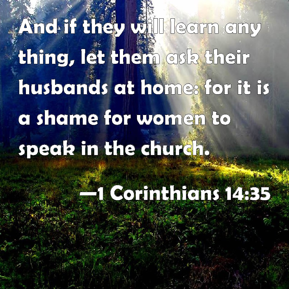 Choose a Background 1 Corinthians 14:35 And if they will learn any thing, let them ask their husbands at home: for it is a shame for women to speak in the church. KJV: And if they will learn any thing, let them ask their husbands at home: for it is a shame for women to speak in the church. DRB: But if they would learn any thing, let them ask their husbands at home. For it is a shame for a woman to speak in the church. DBT: But if they wish to learn anything, let them ask their own husbands at home; for it is a shame for a woman to speak in assembly. ERV: And if they would learn anything, let them ask their own husbands at home: for it is shameful for a woman to speak in the church. WBT: And if they will learn any thing, let them ask their husbands at home; for it is a shame for women to speak in the church. WEB: If they desire to learn anything, let them ask their own husbands at home, for it is shameful for a woman to chatter in the assembly. YLT: and if they wish to learn anything, at home their own husbands let them question, for it is a shame to women to speak in an assembly.Links 1 Corinthians 14:35 NIV • 1 Corinthians 14:35 NLT • 1 Corinthians 14:35 ESV • 1 Corinthians 14:35 NASB • 1 Corinthians 14:35 KJV • 1 Corinthians 14:35 Interlinear • 1 Corinthians 14:35 Commentaries • 1 Corinthians 14:35 Parallel Texts • 1 Corinthians 14:35 Bible Apps • 1 Corinthians 14:35 Parallel • Bible Hub |