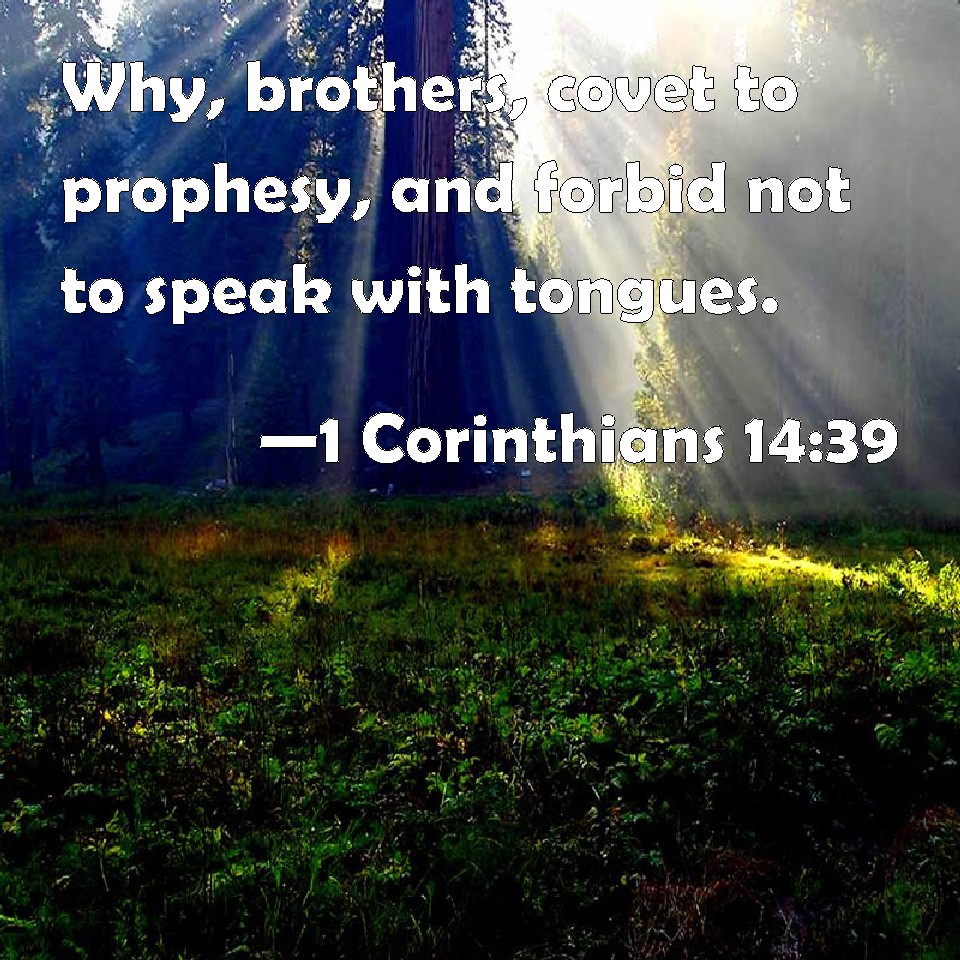 Choose a Background 1 Corinthians 14:39 Why, brothers, covet to prophesy, and forbid not to speak with tongues. KJV: Wherefore, brethren, covet to prophesy, and forbid not to speak with tongues. DRB: Wherefore, brethren, be zealous to prophesy; and forbid not to speak with tongues. DBT: So that, brethren, desire to prophesy, and do not forbid the speaking with tongues. ERV: Wherefore, my brethren, desire earnestly to prophesy, and forbid not to speak with tongues. WBT: Wherefore, brethren, covet to prophesy, and forbid not to speak in languages. WEB: Therefore, brothers, desire earnestly to prophesy, and don't forbid speaking with other languages. YLT: so that, brethren, earnestly desire to prophesy, and to speak with tongues do not forbid;Links 1 Corinthians 14:39 NIV • 1 Corinthians 14:39 NLT • 1 Corinthians 14:39 ESV • 1 Corinthians 14:39 NASB • 1 Corinthians 14:39 KJV • 1 Corinthians 14:39 Interlinear • 1 Corinthians 14:39 Commentaries • 1 Corinthians 14:39 Parallel Texts • 1 Corinthians 14:39 Bible Apps • 1 Corinthians 14:39 Parallel • Bible Hub |