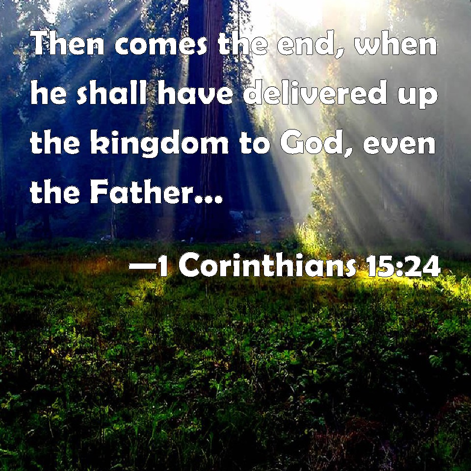 Choose a Background 1 Corinthians 15:24 Then comes the end, when he shall have delivered up the kingdom to God, even the Father; when he shall have put down all rule and all authority and power. KJV: Then cometh the end, when he shall have delivered up the kingdom to God, even the Father; when he shall have put down all rule and all authority and power. DRB: Afterwards the end, when he shall have delivered up the kingdom to God and the Father, when he shall have brought to nought all principality, and power, and virtue. DBT: Then the end, when he gives up the kingdom to him who is God and Father; when he shall have annulled all rule and all authority and power. ERV: Then cometh the end, when he shall deliver up the kingdom to God, even the Father; when he shall have abolished all rule and all authority and power. WBT: Then cometh the end, when he shall have delivered up the kingdom to God, even the Father; when he shall have put down all rule, and all authority, and power. WEB: Then the end comes, when he will deliver up the Kingdom to God, even the Father; when he will have abolished all rule and all authority and power. YLT: then — the end, when he may deliver up the reign to God, even the Father, when he may have made useless all rule, and all authority and power — Links 1 Corinthians 15:24 NIV • 1 Corinthians 15:24 NLT • 1 Corinthians 15:24 ESV • 1 Corinthians 15:24 NASB • 1 Corinthians 15:24 KJV • 1 Corinthians 15:24 Interlinear • 1 Corinthians 15:24 Commentaries • 1 Corinthians 15:24 Parallel Texts • 1 Corinthians 15:24 Bible Apps • 1 Corinthians 15:24 Parallel • Bible Hub |