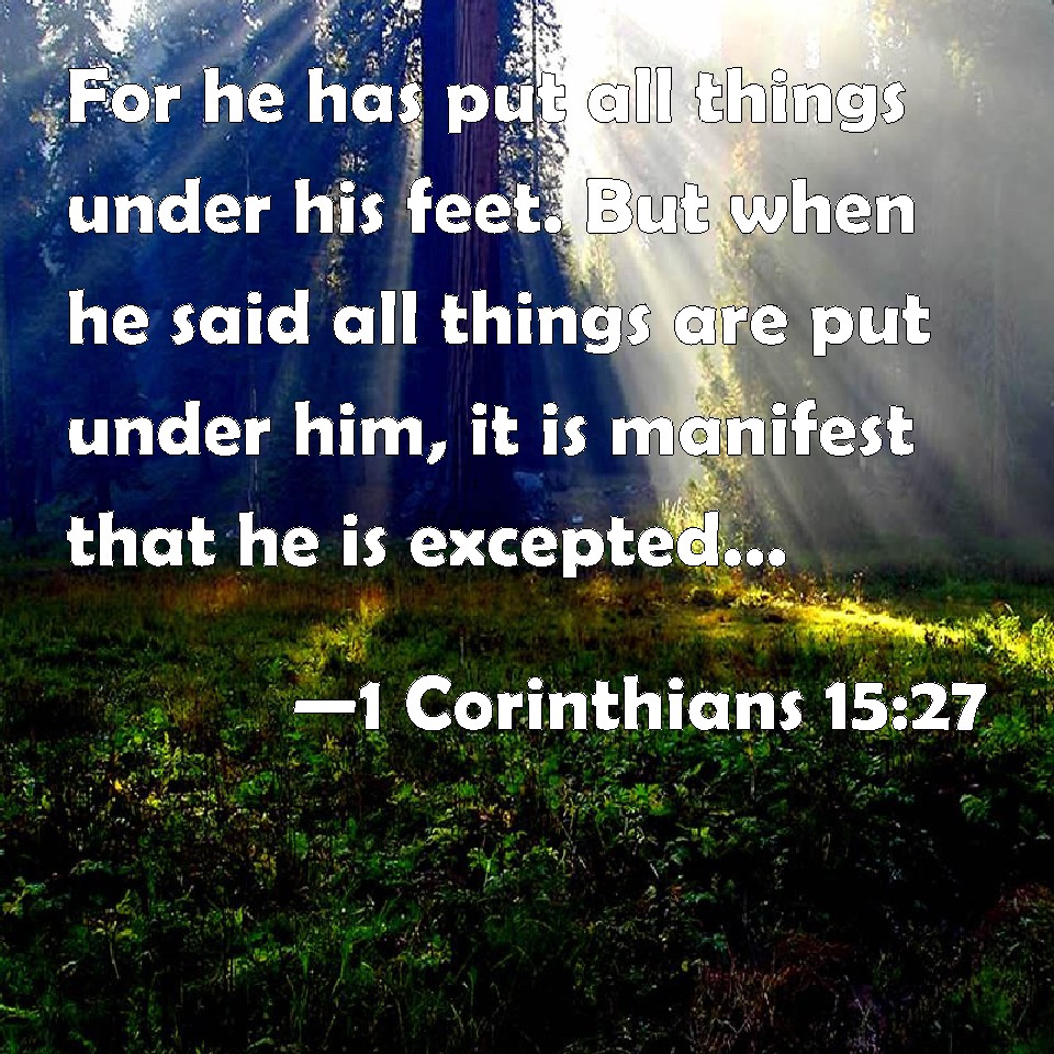 Choose a Background 1 Corinthians 15:27 For he has put all things under his feet. But when he said all things are put under him, it is manifest that he is excepted, which did put all things under him. KJV: For he hath put all things under his feet. But when he saith, all things are put under him, it is manifest that he is excepted, which did put all things under him. DRB: All things are put under him; undoubtedly, he is excepted, who put all things under him. DBT: For he has put all things in subjection under his feet. But when he says that all things are put in subjection, it is evident that it is except him who put all things in subjection to him. ERV: For, He put all things in subjection under his feet. But when he saith, All things are put in subjection, it is evident that he is excepted who did subject all things unto him. WBT: For he hath put all things under his feet. But when he saith, all things are put under him, it is manifest that he is excepted who did put all things under him. WEB: For, "He put all things in subjection under his feet." But when he says, "All things are put in subjection," it is evident that he is excepted who subjected all things to him. YLT: for all things He did put under his feet, and, when one may say that all things have been subjected, it is evident that He is excepted who did subject the all things to him,Links 1 Corinthians 15:27 NIV • 1 Corinthians 15:27 NLT • 1 Corinthians 15:27 ESV • 1 Corinthians 15:27 NASB • 1 Corinthians 15:27 KJV • 1 Corinthians 15:27 Interlinear • 1 Corinthians 15:27 Commentaries • 1 Corinthians 15:27 Parallel Texts • 1 Corinthians 15:27 Bible Apps • 1 Corinthians 15:27 Parallel • Bible Hub |