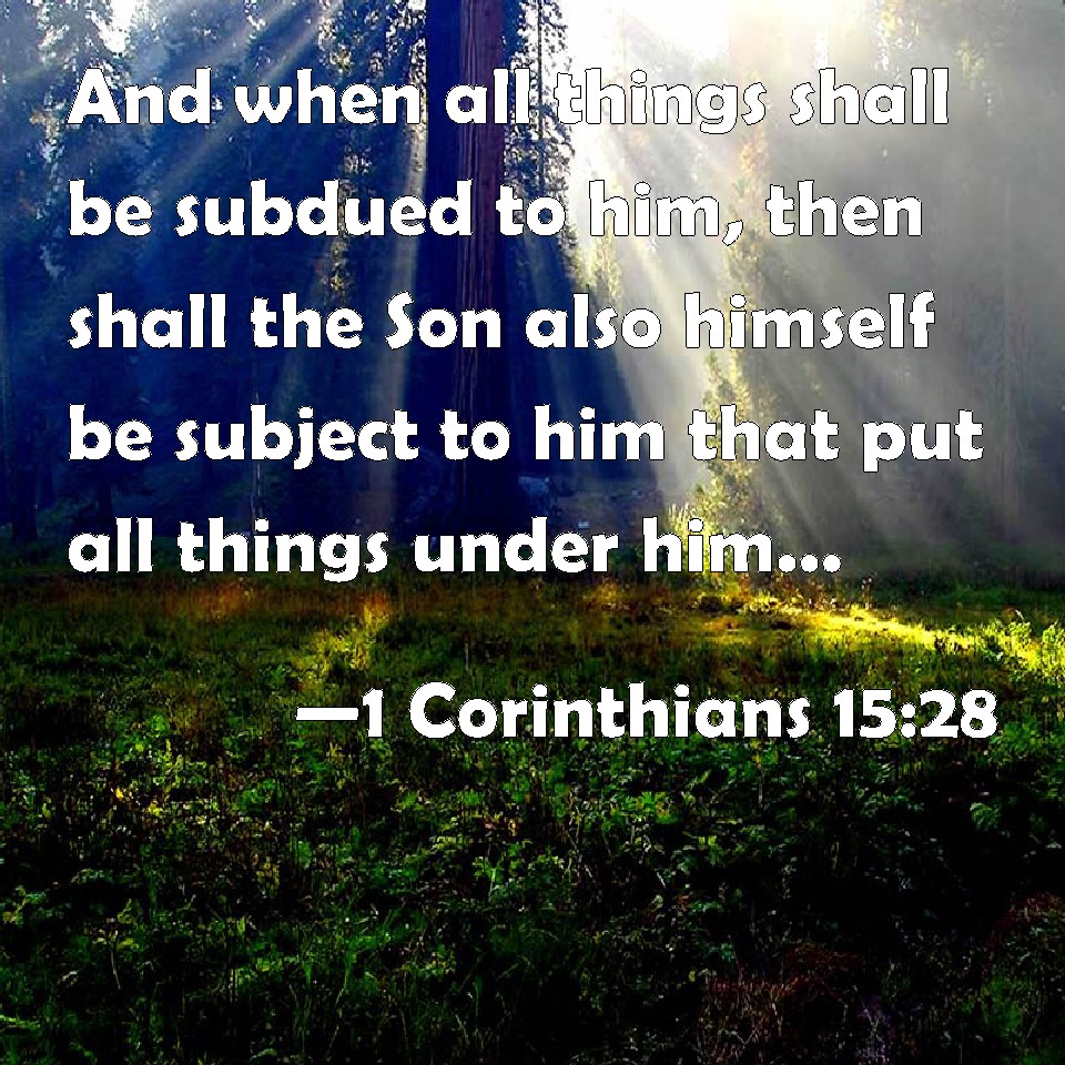 Choose a Background 1 Corinthians 15:28 And when all things shall be subdued to him, then shall the Son also himself be subject to him that put all things under him, that God may be all in all. KJV: And when all things shall be subdued unto him, then shall the Son also himself be subject unto him that put all things under him, that God may be all in all. DRB: And when all things shall be subdued unto him, then the Son also himself shall be subject unto him that put all things under him, that God may be all in all. DBT: But when all things shall have been brought into subjection to him, then the Son also himself shall be placed in subjection to him who put all things in subjection to him, that God may be all in all.) ERV: And when all things have been subjected unto him, then shall the Son also himself be subjected to him that did subject all things unto him, that God may be all in all. WBT: And when all things shall be subdued to him, then shall the Son also himself be subject to him that put all things under him, that God may be all in all. WEB: When all things have been subjected to him, then the Son will also himself be subjected to him who subjected all things to him, that God may be all in all. YLT: and when the all things may be subjected to him, then the Son also himself shall be subject to Him, who did subject to him the all things, that God may be the all in all.Links 1 Corinthians 15:28 NIV • 1 Corinthians 15:28 NLT • 1 Corinthians 15:28 ESV • 1 Corinthians 15:28 NASB • 1 Corinthians 15:28 KJV • 1 Corinthians 15:28 Interlinear • 1 Corinthians 15:28 Commentaries • 1 Corinthians 15:28 Parallel Texts • 1 Corinthians 15:28 Bible Apps • 1 Corinthians 15:28 Parallel • Bible Hub |