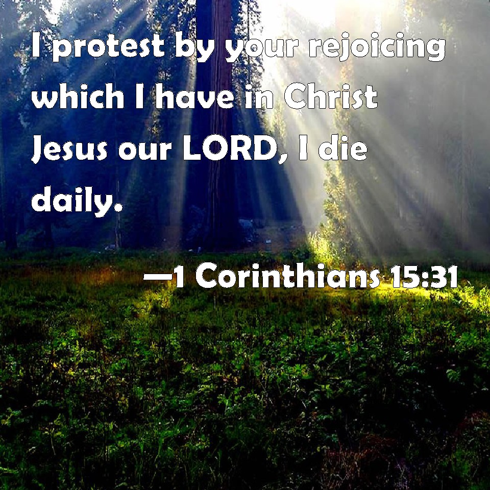 Choose a Background 1 Corinthians 15:31 I protest by your rejoicing which I have in Christ Jesus our LORD, I die daily. KJV: I protest by your rejoicing which I have in Christ Jesus our Lord, I die daily. DRB: I die daily, I protest by your glory, brethren, which I have in Christ Jesus our Lord. DBT: Daily I die, by your boasting which I have in Christ Jesus our Lord. ERV: I protest by that glorying in you, brethren, which I have in Christ Jesus our Lord, I die daily. WBT: I protest by your rejoicing which I have in Christ Jesus our Lord, I die daily. WEB: I affirm, by the boasting in you which I have in Christ Jesus our Lord, I die daily. YLT: Every day do I die, by the glorying of you that I have in Christ Jesus our Lord:Links 1 Corinthians 15:31 NIV • 1 Corinthians 15:31 NLT • 1 Corinthians 15:31 ESV • 1 Corinthians 15:31 NASB • 1 Corinthians 15:31 KJV • 1 Corinthians 15:31 Interlinear • 1 Corinthians 15:31 Commentaries • 1 Corinthians 15:31 Parallel Texts • 1 Corinthians 15:31 Bible Apps • 1 Corinthians 15:31 Parallel • Bible Hub |