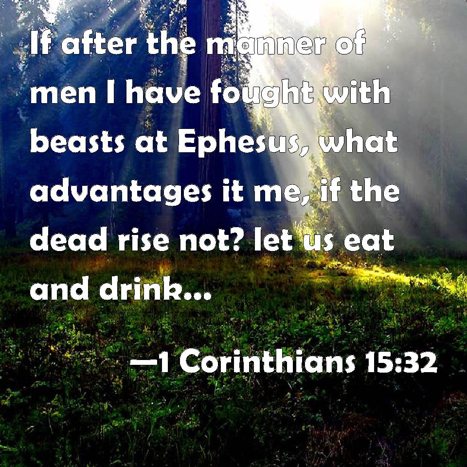 Choose a Background 1 Corinthians 15:32 If after the manner of men I have fought with beasts at Ephesus, what advantages it me, if the dead rise not? let us eat and drink; for to morrow we die. KJV: If after the manner of men I have fought with beasts at Ephesus, what advantageth it me, if the dead rise not? let us eat and drink; for to morrow we die. DRB: If (according to man) I fought with beasts at Ephesus, what doth it profit me, if the dead rise not again? Let us eat and drink, for to morrow we shall die. DBT: If, to speak after the manner of man, I have fought with beasts in Ephesus, what is the profit to me if those that are dead do not rise? let us eat and drink; for to-morrow we die. ERV: If after the manner of men I fought with beasts at Ephesus, what doth it profit me? If the dead are not raised, let us eat and drink, for tomorrow we die. WBT: If after the manner of men I have fought with beasts at Ephesus, what advantage is it to me, if the dead rise not? let us eat and drink; for to-morrow we die. WEB: If I fought with animals at Ephesus for human purposes, what does it profit me? If the dead are not raised, then "let us eat and drink, for tomorrow we die." YLT: if after the manner of a man with wild beasts I fought in Ephesus, what the advantage to me if the dead do not rise? let us eat and drink, for to-morrow we die!Links 1 Corinthians 15:32 NIV • 1 Corinthians 15:32 NLT • 1 Corinthians 15:32 ESV • 1 Corinthians 15:32 NASB • 1 Corinthians 15:32 KJV • 1 Corinthians 15:32 Interlinear • 1 Corinthians 15:32 Commentaries • 1 Corinthians 15:32 Parallel Texts • 1 Corinthians 15:32 Bible Apps • 1 Corinthians 15:32 Parallel • Bible Hub |