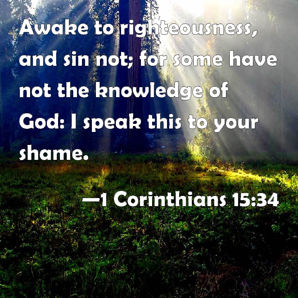 Choose a Background 1 Corinthians 15:34 Awake to righteousness, and sin not; for some have not the knowledge of God: I speak this to your shame. KJV: Awake to righteousness, and sin not; for some have not the knowledge of God: I speak this to your shame. DRB: Awake, ye just, and sin not. For some have not the knowledge of God, I speak it to your shame. DBT: Awake up righteously, and sin not; for some are ignorant of God: I speak to you as a matter of shame. ERV: Awake up righteously, and sin not; for some have no knowledge of God: I speak this to move you to shame. WBT: Awake to righteousness, and sin not; for some have not the knowledge of God. I speak this to your shame. WEB: Wake up righteously, and don't sin, for some have no knowledge of God. I say this to your shame. YLT: awake up, as is right, and sin not; for certain have an ignorance of God; for shame to you I say it.Links 1 Corinthians 15:34 NIV • 1 Corinthians 15:34 NLT • 1 Corinthians 15:34 ESV • 1 Corinthians 15:34 NASB • 1 Corinthians 15:34 KJV • 1 Corinthians 15:34 Interlinear • 1 Corinthians 15:34 Commentaries • 1 Corinthians 15:34 Parallel Texts • 1 Corinthians 15:34 Bible Apps • 1 Corinthians 15:34 Parallel • Bible Hub |