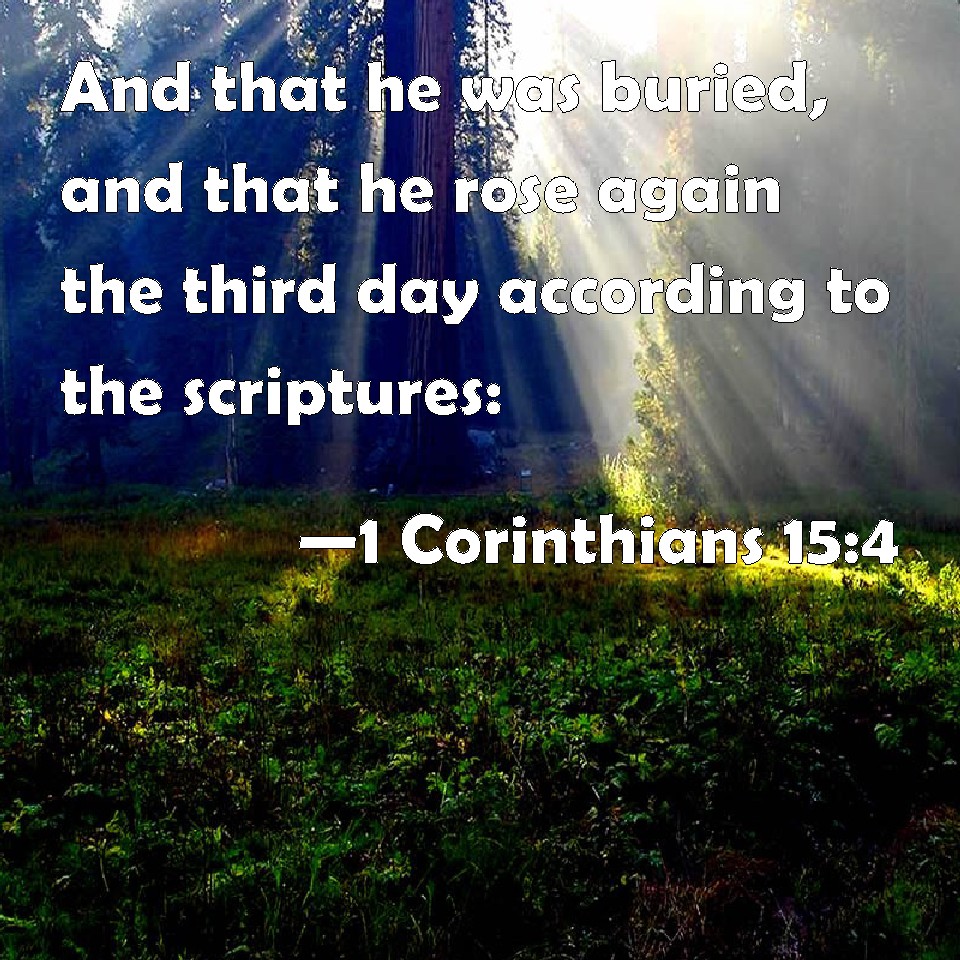 Choose a Background 1 Corinthians 15:4 And that he was buried, and that he rose again the third day according to the scriptures: KJV: And that he was buried, and that he rose again the third day according to the scriptures: DRB: And that he was buried, and that he rose again the third day, according to the scriptures: DBT: and that he was buried; and that he was raised the third day, according to the scriptures; ERV: and that he was buried; and that he hath been raised on the third day according to the scriptures; WBT: And that he was buried, and that he rose again the third day according to the scriptures: WEB: that he was buried, that he was raised on the third day according to the Scriptures, YLT: and that he was buried, and that he hath risen on the third day, according to the Writings,Links 1 Corinthians 15:4 NIV • 1 Corinthians 15:4 NLT • 1 Corinthians 15:4 ESV • 1 Corinthians 15:4 NASB • 1 Corinthians 15:4 KJV • 1 Corinthians 15:4 Interlinear • 1 Corinthians 15:4 Commentaries • 1 Corinthians 15:4 Parallel Texts • 1 Corinthians 15:4 Bible Apps • 1 Corinthians 15:4 Parallel • Bible Hub |