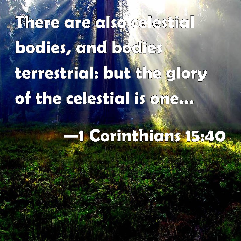 Choose a Background 1 Corinthians 15:40 There are also celestial bodies, and bodies terrestrial: but the glory of the celestial is one, and the glory of the terrestrial is another. KJV: There are also celestial bodies, and bodies terrestrial: but the glory of the celestial is one, and the glory of the terrestrial is another. DRB: And there are bodies celestial, and bodies terrestrial: but, one is the glory of the celestial, and another of the terrestrial. DBT: And there are heavenly bodies, and earthly bodies: but different is the glory of the heavenly, different that of the earthly: ERV: There are also celestial bodies, and bodies terrestrial: but the glory of the celestial is one, and the glory of the terrestrial is another. WBT: There are also celestial bodies, and bodies terrestrial: but the glory of the celestial is one, and the glory of the terrestrial is another. WEB: There are also celestial bodies, and terrestrial bodies; but the glory of the celestial differs from that of the terrestrial. YLT: and there are heavenly bodies, and earthly bodies; but one is the glory of the heavenly, and another that of the earthly;Links 1 Corinthians 15:40 NIV • 1 Corinthians 15:40 NLT • 1 Corinthians 15:40 ESV • 1 Corinthians 15:40 NASB • 1 Corinthians 15:40 KJV • 1 Corinthians 15:40 Interlinear • 1 Corinthians 15:40 Commentaries • 1 Corinthians 15:40 Parallel Texts • 1 Corinthians 15:40 Bible Apps • 1 Corinthians 15:40 Parallel • Bible Hub |