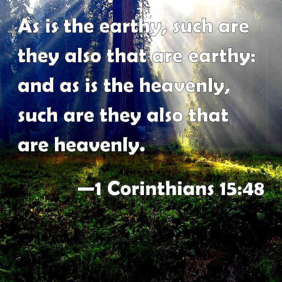 Choose a Background 1 Corinthians 15:48 As is the earthy, such are they also that are earthy: and as is the heavenly, such are they also that are heavenly. KJV: As is the earthy, such are they also that are earthy: and as is the heavenly, such are they also that are heavenly. DRB: Such as is the earthly, such also are the earthly: and such as is the heavenly, such also are they that are heavenly. DBT: Such as he made of dust, such also those made of dust; and such as the heavenly one, such also the heavenly ones. ERV: As is the earthy, such are they also that are earthy: and as is the heavenly, such are they also that are heavenly. WBT: As is the earthy, such are they also that are earthy: and as is the heavenly, such are they also that are heavenly. WEB: As is the one made of dust, such are those who are also made of dust; and as is the heavenly, such are they also that are heavenly. YLT: as is the earthy, such are also the earthy; and as is the heavenly, such are also the heavenly;Links 1 Corinthians 15:48 NIV • 1 Corinthians 15:48 NLT • 1 Corinthians 15:48 ESV • 1 Corinthians 15:48 NASB • 1 Corinthians 15:48 KJV • 1 Corinthians 15:48 Interlinear • 1 Corinthians 15:48 Commentaries • 1 Corinthians 15:48 Parallel Texts • 1 Corinthians 15:48 Bible Apps • 1 Corinthians 15:48 Parallel • Bible Hub |