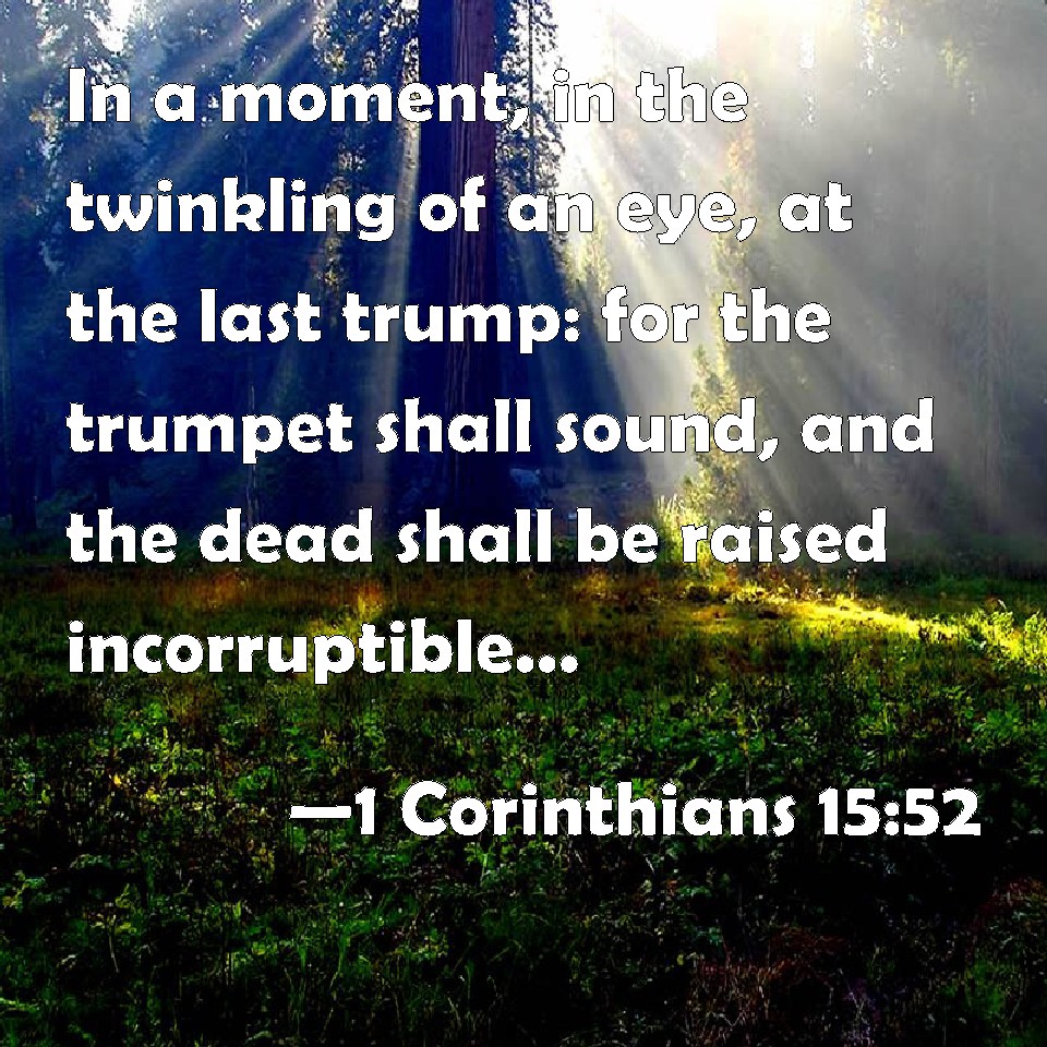Choose a Background 1 Corinthians 15:52 In a moment, in the twinkling of an eye, at the last trump: for the trumpet shall sound, and the dead shall be raised incorruptible, and we shall be changed. KJV: In a moment, in the twinkling of an eye, at the last trump: for the trumpet shall sound, and the dead shall be raised incorruptible, and we shall be changed. DRB: In a moment, in the twinkling of an eye, at the last trumpet: for the trumpet shall sound, and the dead shall rise again incorruptible: and we shall be changed. DBT: in an instant, in the twinkling of an eye, at the last trumpet; for the trumpet shall sound, and the dead shall be raised incorruptible, and we shall be changed. ERV: in a moment, in the twinkling of an eye, at the last trump: for the trumpet shall sound, and the dead shall be raised incorruptible, and we shall be changed. WBT: In a moment, in the twinkling of an eye, at the last trumpet; for the trumpet shall sound, and the dead shall be raised incorruptible, and we shall be changed. WEB: in a moment, in the twinkling of an eye, at the last trumpet. For the trumpet will sound, and the dead will be raised incorruptible, and we will be changed. YLT: in a moment, in the twinkling of an eye, in the last trumpet, for it shall sound, and the dead shall be raised incorruptible, and we — we shall be changed:Links 1 Corinthians 15:52 NIV • 1 Corinthians 15:52 NLT • 1 Corinthians 15:52 ESV • 1 Corinthians 15:52 NASB • 1 Corinthians 15:52 KJV • 1 Corinthians 15:52 Interlinear • 1 Corinthians 15:52 Commentaries • 1 Corinthians 15:52 Parallel Texts • 1 Corinthians 15:52 Bible Apps • 1 Corinthians 15:52 Parallel • Bible Hub |