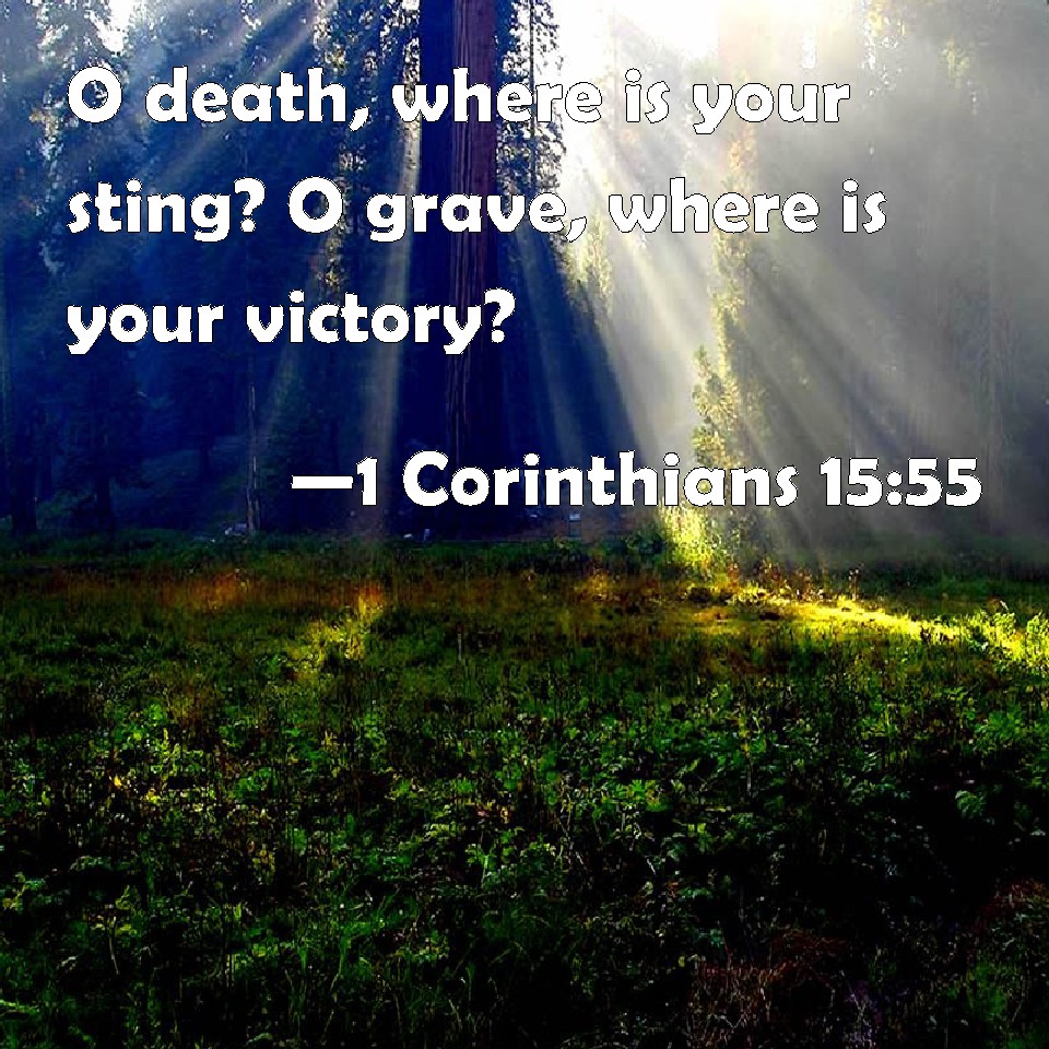 Choose a Background 1 Corinthians 15:55 O death, where is your sting? O grave, where is your victory? KJV: O death, where is thy sting? O grave, where is thy victory? DRB: O death, where is thy victory? O death, where is thy sting? DBT: Where, O death, is thy sting? where, O death, thy victory? ERV: O death, where is thy victory? O death, where is thy sting? WBT: O death, where is thy sting? O grave, where is thy victory? WEB: "Death, where is your sting? Hades, where is your victory?" YLT: where, O Death, thy sting? where, O Hades, thy victory?'Links 1 Corinthians 15:55 NIV • 1 Corinthians 15:55 NLT • 1 Corinthians 15:55 ESV • 1 Corinthians 15:55 NASB • 1 Corinthians 15:55 KJV • 1 Corinthians 15:55 Interlinear • 1 Corinthians 15:55 Commentaries • 1 Corinthians 15:55 Parallel Texts • 1 Corinthians 15:55 Bible Apps • 1 Corinthians 15:55 Parallel • Bible Hub |