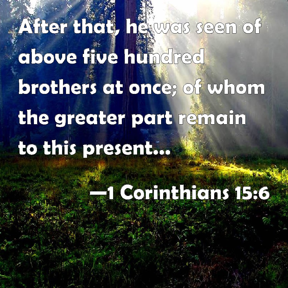 Choose a Background 1 Corinthians 15:6 After that, he was seen of above five hundred brothers at once; of whom the greater part remain to this present, but some are fallen asleep. KJV: After that, he was seen of above five hundred brethren at once; of whom the greater part remain unto this present, but some are fallen asleep. DRB: Then he was seen by more than five hundred brethren at once: of whom many remain until this present, and some are fallen asleep. DBT: Then he appeared to above five hundred brethren at once, of whom the most remain until now, but some also have fallen asleep. ERV: then he appeared to above five hundred brethren at once, of whom the greater part remain until now, but some are fallen asleep; WBT: After that he was seen by above five hundred brethren at once; of whom the greater part remain to this present, but some have fallen asleep. WEB: Then he appeared to over five hundred brothers at once, most of whom remain until now, but some have also fallen asleep. YLT: afterwards he appeared to above five hundred brethren at once, of whom the greater part remain till now, and certain also did fall asleep;Links 1 Corinthians 15:6 NIV • 1 Corinthians 15:6 NLT • 1 Corinthians 15:6 ESV • 1 Corinthians 15:6 NASB • 1 Corinthians 15:6 KJV • 1 Corinthians 15:6 Interlinear • 1 Corinthians 15:6 Commentaries • 1 Corinthians 15:6 Parallel Texts • 1 Corinthians 15:6 Bible Apps • 1 Corinthians 15:6 Parallel • Bible Hub |