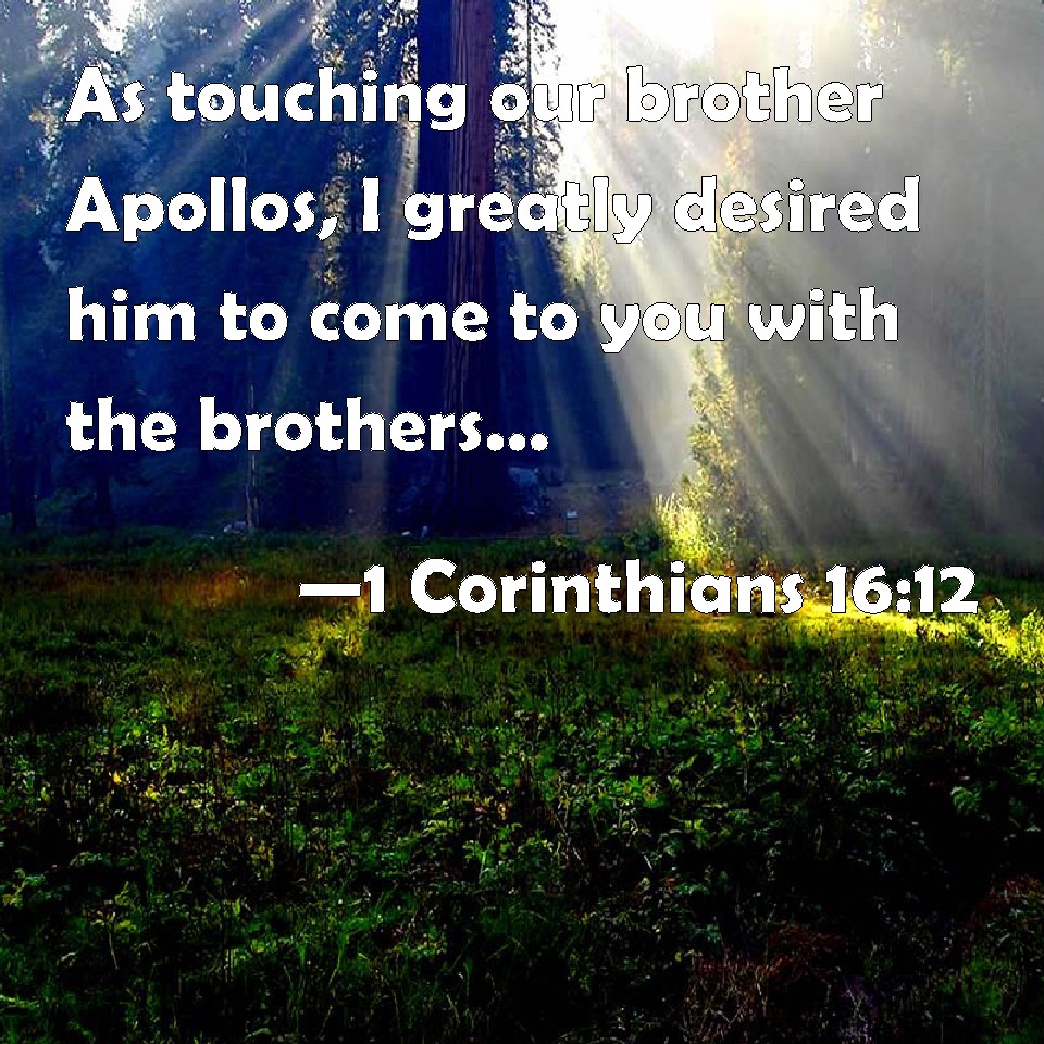 Choose a Background 1 Corinthians 16:12 As touching our brother Apollos, I greatly desired him to come to you with the brothers: but his will was not at all to come at this time; but he will come when he shall have convenient time. KJV: As touching our brother Apollos, I greatly desired him to come unto you with the brethren: but his will was not at all to come at this time; but he will come when he shall have convenient time. DRB: And touching our brother Apollo, I give you to understand, that I much entreated him to come unto you with the breatheren: and indeed it was not his will at all to come at this time. But he will come when he shall have leisure. DBT: Now concerning the brother Apollos, I begged him much that he would go to you with the brethren; but it was not at all his will to go now; but he will come when he shall have good opportunity. ERV: But as touching Apollos the brother, I besought him much to come unto you with the brethren: and it was not at all his will to come now; but he will come when he shall have opportunity. WBT: As concerning our brother Apollos, I greatly desired him to come to you with the brethren: but his will was not at all to come at this time; but he will come when he shall have convenient time. WEB: Now concerning Apollos, the brother, I strongly urged him to come to you with the brothers; and it was not at all his desire to come now; but he will come when he has an opportunity. YLT: and concerning Apollos our brother, much I did entreat him that he may come unto you with the brethren, and it was not at all his will that he may come now, and he will come when he may find convenient.Links 1 Corinthians 16:12 NIV • 1 Corinthians 16:12 NLT • 1 Corinthians 16:12 ESV • 1 Corinthians 16:12 NASB • 1 Corinthians 16:12 KJV • 1 Corinthians 16:12 Interlinear • 1 Corinthians 16:12 Commentaries • 1 Corinthians 16:12 Parallel Texts • 1 Corinthians 16:12 Bible Apps • 1 Corinthians 16:12 Parallel • Bible Hub |
