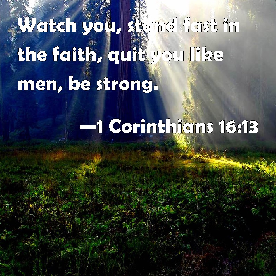 Choose a Background 1 Corinthians 16:13 Watch you, stand fast in the faith, quit you like men, be strong. KJV: Watch ye, stand fast in the faith, quit you like men, be strong. DRB: Watch ye, stand fast in the faith,do manfully, and be strengthened. DBT: Be vigilant; stand fast in the faith; quit yourselves like men; be strong. ERV: Watch ye, stand fast in the faith, quit you like men, be strong. WBT: Watch ye, stand fast in the faith, acquit yourselves like men, be strong. WEB: Watch! Stand firm in the faith! Be courageous! Be strong! YLT: Watch ye, stand in the faith; be men, be strong;Links 1 Corinthians 16:13 NIV • 1 Corinthians 16:13 NLT • 1 Corinthians 16:13 ESV • 1 Corinthians 16:13 NASB • 1 Corinthians 16:13 KJV • 1 Corinthians 16:13 Interlinear • 1 Corinthians 16:13 Commentaries • 1 Corinthians 16:13 Parallel Texts • 1 Corinthians 16:13 Bible Apps • 1 Corinthians 16:13 Parallel • Bible Hub |