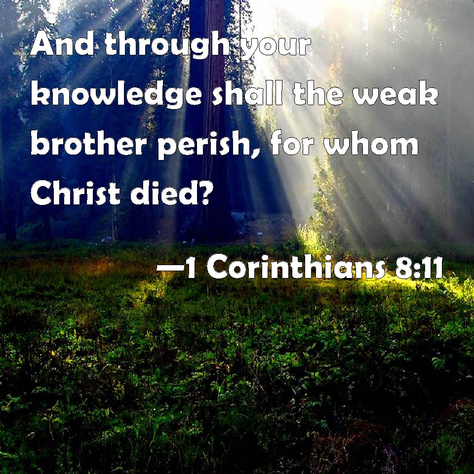 Choose a Background 1 Corinthians 8:11 And through your knowledge shall the weak brother perish, for whom Christ died? KJV: And through thy knowledge shall the weak brother perish, for whom Christ died? DRB: And through thy knowledge shall the weak brother perish, for whom Christ hath died ? DBT: and the weak one, the brother for whose sake Christ died, will perish through thy knowledge. ERV: For through thy knowledge he that is weak perisheth, the brother for whose sake Christ died. WBT: And through thy knowledge shall the weak brother perish, for whom Christ died? WEB: And through your knowledge, he who is weak perishes, the brother for whose sake Christ died. YLT: and the brother who is infirm shall perish by thy knowledge, because of whom Christ died?Links 1 Corinthians 8:11 NIV • 1 Corinthians 8:11 NLT • 1 Corinthians 8:11 ESV • 1 Corinthians 8:11 NASB • 1 Corinthians 8:11 KJV • 1 Corinthians 8:11 Interlinear • 1 Corinthians 8:11 Commentaries • 1 Corinthians 8:11 Parallel Texts • 1 Corinthians 8:11 Bible Apps • 1 Corinthians 8:11 Parallel • Bible Hub |