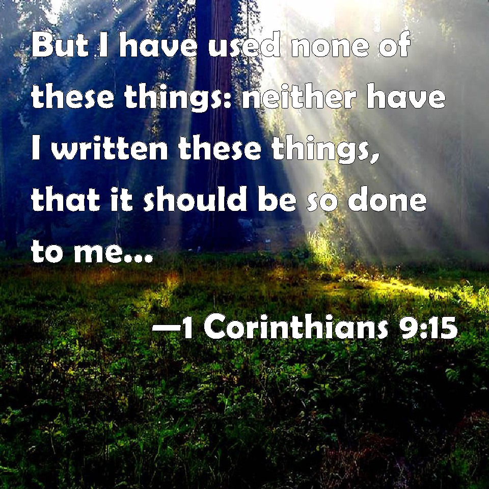 Choose a Background 1 Corinthians 9:15 But I have used none of these things: neither have I written these things, that it should be so done to me: for it were better for me to die, than that any man should make my glorying void. KJV: But I have used none of these things: neither have I written these things, that it should be so done unto me: for it were better for me to die, than that any man should make my glorying void. DRB: But I have used none of these things. Neither have I written these things, that they should be so done unto me: for it is good for me to die, rather than that any man should make my glory void. DBT: But I have used none of these things. Now I have not written these things that it should be thus in my case; for it were good for me rather to die than that any one should make vain my boast. ERV: But I have used none of these things: and I write not these things that it may be so done in my case: for it were good for me rather to die, than that any man should make my glorying void. WBT: But I have used none of these things: neither have I written these things, that it should be so done to me: for it were better for me to die, than that any man should make my glorying void. WEB: But I have used none of these things, and I don't write these things that it may be done so in my case; for I would rather die, than that anyone should make my boasting void. YLT: And I have used none of these things; neither did I write these things that it may be so done in my case, for it is good for me rather to die, than that any one may make my glorying void;Links 1 Corinthians 9:15 NIV • 1 Corinthians 9:15 NLT • 1 Corinthians 9:15 ESV • 1 Corinthians 9:15 NASB • 1 Corinthians 9:15 KJV • 1 Corinthians 9:15 Interlinear • 1 Corinthians 9:15 Commentaries • 1 Corinthians 9:15 Parallel Texts • 1 Corinthians 9:15 Bible Apps • 1 Corinthians 9:15 Parallel • Bible Hub |