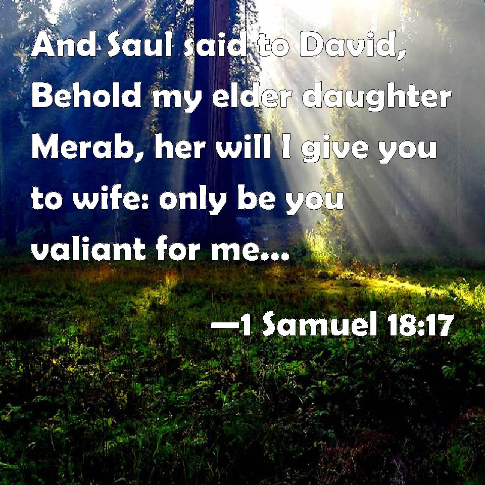 Choose a Background 1 Samuel 18:17 And Saul said to David, Behold my elder daughter Merab, her will I give you to wife: only be you valiant for me, and fight the LORD's battles. For Saul said, Let not my hand be on him, but let the hand of the Philistines be on him. KJV: And Saul said to David, Behold my elder daughter Merab, her will I give thee to wife: only be thou valiant for me, and fight the LORD'S battles. For Saul said, Let not mine hand be upon him, but let the hand of the Philistines be upon him. DRB: And Saul said to David: Behold my elder daughter Merob, her will I give thee to wife: only be a valiant man, and fight the battles of the Lord. Now Saul said within himself: Let not my hand be upon him, but let the hands of the Philistines be upon him. DBT: And Saul said to David, Behold my eldest daughter Merab, her will I give thee to wife; only be thou valiant for me, and fight Jehovah's battles. But Saul thought, My hand shall not be upon him, but the hand of the Philistines shall be upon him. ERV: And Saul said to David, Behold, my elder daughter Merab, her will I give thee to wife: only be thou valiant for me. and fight the LORD'S battles. For Saul said, Let not mine hand be upon him, but let the hand of the Philistines be upon him. WBT: And Saul said to David, Behold, my elder daughter Merab, her will I give thee for a wife: only be thou valiant for me, and fight the LORD'S battles. For Saul said, Let not my hand be upon him, but let the hand of the Philistines be upon him. WEB: Saul said to David, "Behold, my elder daughter Merab, I will give her to you as wife. Only be valiant for me, and fight Yahweh's battles." For Saul said, "Don't let my hand be on him, but let the hand of the Philistines be on him." YLT: And Saul saith unto David, 'Lo, my elder daughter Merab — her I give to thee for a wife; only, be to me for a son of valour, and fight the battles of Jehovah;' and Saul said, 'Let not my hand be on him, but let the hand of the Philistines be upon him.'Links 1 Samuel 18:17 NIV • 1 Samuel 18:17 NLT • 1 Samuel 18:17 ESV • 1 Samuel 18:17 NASB • 1 Samuel 18:17 KJV • 1 Samuel 18:17 Interlinear • 1 Samuel 18:17 Commentaries • 1 Samuel 18:17 Parallel Texts • 1 Samuel 18:17 Bible Apps • 1 Samuel 18:17 Parallel • Bible Hub |
