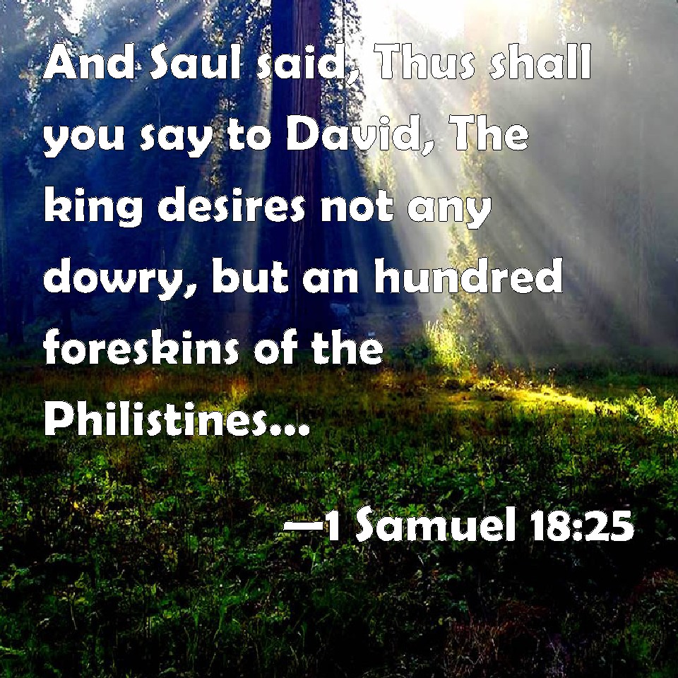 Choose a Background 1 Samuel 18:25 And Saul said, Thus shall you say to David, The king desires not any dowry, but an hundred foreskins of the Philistines, to be avenged of the king's enemies. But Saul thought to make David fall by the hand of the Philistines. KJV: And Saul said, Thus shall ye say to David, The king desireth not any dowry, but an hundred foreskins of the Philistines, to be avenged of the king's enemies. But Saul thought to make David fall by the hand of the Philistines. DRB: And Saul said: Speak thus to David: The king desireth not any dowry, but only a hundred foreskins of the Philistines, to be avenged of the king's enemies. Now Saul thought to deliver David into the hands of the Philistines. DBT: And Saul said, Thus shall ye say to David: The king does not desire any dowry, but a hundred foreskins of the Philistines, to be avenged of the king's enemies. But Saul thought to make David fall by the hand of the Philistines. ERV: And Saul said, Thus shall ye say to David, The king desireth not any dowry, but an hundred foreskins of the Philistines, to be avenged of the king's enemies. Now Saul thought to make David fall by the hand of the Philistines. WBT: And Saul said, Thus shall ye say to David, The king desireth not any dower, but a hundred foreskins of the Philistines, to be avenged of the king's enemies. But Saul thought to make David fall by the hand of the Philistines. WEB: Saul said, "You shall tell David, 'The king desires no dowry except one hundred foreskins of the Philistines, to be avenged of the king's enemies.'" Now Saul thought to make David fall by the hand of the Philistines. YLT: And Saul saith, 'Thus do ye say to David, There is no delight to the king in dowry, but in a hundred foreskins of the Philistines — to be avenged on the enemies of the king;' and Saul thought to cause David to fall by the hand of the Philistines.Links 1 Samuel 18:25 NIV • 1 Samuel 18:25 NLT • 1 Samuel 18:25 ESV • 1 Samuel 18:25 NASB • 1 Samuel 18:25 KJV • 1 Samuel 18:25 Interlinear • 1 Samuel 18:25 Commentaries • 1 Samuel 18:25 Parallel Texts • 1 Samuel 18:25 Bible Apps • 1 Samuel 18:25 Parallel • Bible Hub |