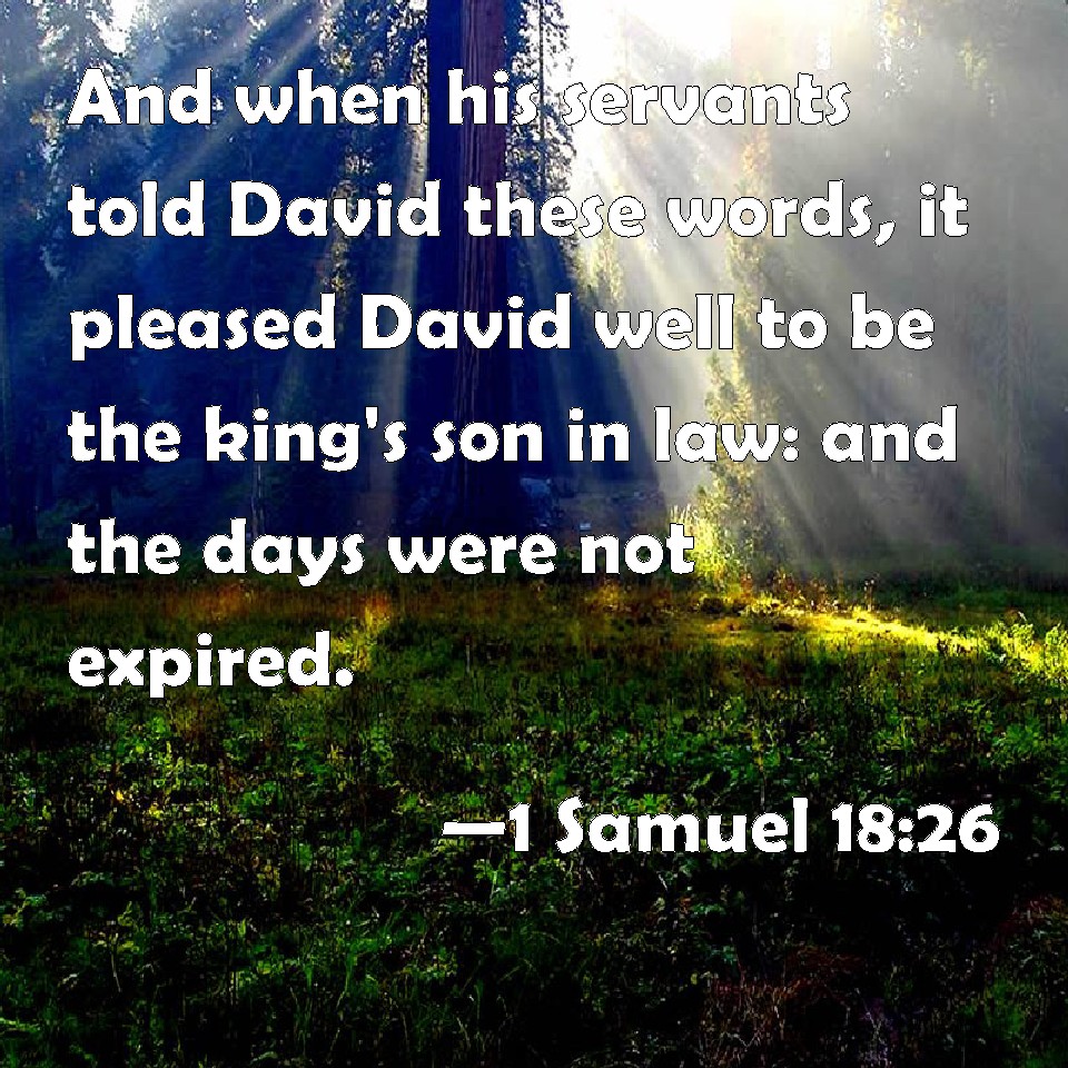 Choose a Background 1 Samuel 18:26 And when his servants told David these words, it pleased David well to be the king's son in law: and the days were not expired. KJV: And when his servants told David these words, it pleased David well to be the king's son in law: and the days were not expired. DRB: And when his servants had told David the words that Saul had said, the word was pleasing in the eyes of David to be the king's son in law. DBT: And his servants told David these words; and the thing was right in David's sight to be the king's son-in-law. And the days were not expired, ERV: And when his servants told David these words, it pleased David well to be the king's son in law. And the days were not expired; WBT: And when his servants told David these words, it pleased David well to be the king's son-in-law: and the days had not expired. WEB: When his servants told David these words, it pleased David well to be the king's son-in-law. The days were not expired; YLT: And his servants declare to David these words, and the thing is right in the eyes of David, to be son-in-law to the king; and the days have not been full,Links 1 Samuel 18:26 NIV • 1 Samuel 18:26 NLT • 1 Samuel 18:26 ESV • 1 Samuel 18:26 NASB • 1 Samuel 18:26 KJV • 1 Samuel 18:26 Interlinear • 1 Samuel 18:26 Commentaries • 1 Samuel 18:26 Parallel Texts • 1 Samuel 18:26 Bible Apps • 1 Samuel 18:26 Parallel • Bible Hub |