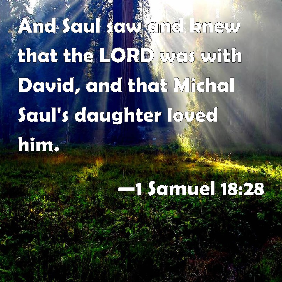 Choose a Background 1 Samuel 18:28 And Saul saw and knew that the LORD was with David, and that Michal Saul's daughter loved him. KJV: And Saul saw and knew that the LORD was with David, and that Michal Saul's daughter loved him. DRB: And Saul saw, and understood that the Lord was with David. And Michol the daughter of Saul loved him. DBT: And Saul saw and knew that Jehovah was with David; and Michal Saul's daughter loved him. ERV: And Saul saw and knew that the LORD was with David; and Michal Saul's daughter loved him. WBT: And Saul saw and knew that the LORD was with David, and that Michal, Saul's daughter, loved him. WEB: Saul saw and knew that Yahweh was with David; and Michal, Saul's daughter, loved him. YLT: And Saul seeth and knoweth that Jehovah is with David, and Michal daughter of Saul hath loved him,Links 1 Samuel 18:28 NIV • 1 Samuel 18:28 NLT • 1 Samuel 18:28 ESV • 1 Samuel 18:28 NASB • 1 Samuel 18:28 KJV • 1 Samuel 18:28 Interlinear • 1 Samuel 18:28 Commentaries • 1 Samuel 18:28 Parallel Texts • 1 Samuel 18:28 Bible Apps • 1 Samuel 18:28 Parallel • Bible Hub |