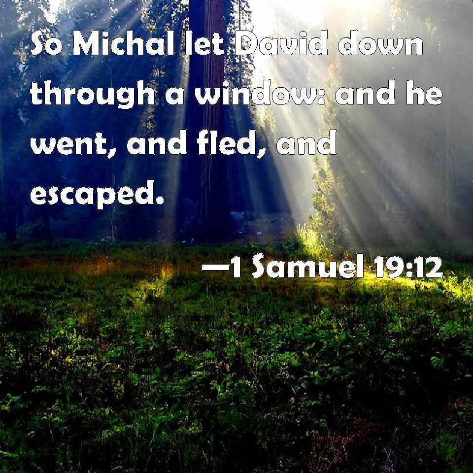 Choose a Background 1 Samuel 19:12 So Michal let David down through a window: and he went, and fled, and escaped. KJV: So Michal let David down through a window: and he went, and fled, and escaped. DRB: She let him down through a window. And he went and fled away and escaped. DBT: And Michal let David down through a window; and he went, and fled and escaped. ERV: So Michal let David down through the window: and he went, and fled, and escaped; WBT: So Michal let David down through a window: and he went, and fled, and escaped. WEB: So Michal let David down through the window. He went, fled, and escaped. YLT: And Michal causeth David to go down through the window, and he goeth on, and fleeth, and escapeth;Links 1 Samuel 19:12 NIV • 1 Samuel 19:12 NLT • 1 Samuel 19:12 ESV • 1 Samuel 19:12 NASB • 1 Samuel 19:12 KJV • 1 Samuel 19:12 Interlinear • 1 Samuel 19:12 Commentaries • 1 Samuel 19:12 Parallel Texts • 1 Samuel 19:12 Bible Apps • 1 Samuel 19:12 Parallel • Bible Hub |