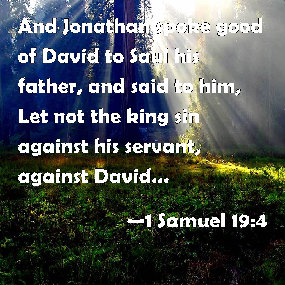 Choose a Background 1 Samuel 19:4 And Jonathan spoke good of David to Saul his father, and said to him, Let not the king sin against his servant, against David; because he has not sinned against you, and because his works have been to you-ward very good: KJV: And Jonathan spake good of David unto Saul his father, and said unto him, Let not the king sin against his servant, against David; because he hath not sinned against thee, and because his works have been to theeward very good: DRB: And Jonathan spoke good things of David to Saul his father: and said to him: Sin not, O king, against thy servant, David, because he hath not sinned against thee, and his works are very good towards thee. DBT: And Jonathan spoke good of David to Saul his father, and said to him, Let not the king sin against his servant, against David, because he has not sinned against thee; for also what he did was very advantageous to thee; ERV: And Jonathan spake good of David unto Saul his father, and said unto him, Let not the king sin against his servant, against David; because he hath not sinned against thee, and because his works have been to thee-ward very good: WBT: And Jonathan spoke good of David to Saul his father, and said to him, Let not the king sin against his servant, against David; because he hath not sinned against thee, and because his works have been toward thee very good: WEB: Jonathan spoke good of David to Saul his father, and said to him, "Don't let the king sin against his servant, against David; because he has not sinned against you, and because his works have been very good toward you; YLT: And Jonathan speaketh good of David unto Saul his father, and saith unto him, 'Let not the king sin against his servant, against David, because he hath not sinned against thee, and because his works for thee are very good;Links 1 Samuel 19:4 NIV • 1 Samuel 19:4 NLT • 1 Samuel 19:4 ESV • 1 Samuel 19:4 NASB • 1 Samuel 19:4 KJV • 1 Samuel 19:4 Interlinear • 1 Samuel 19:4 Commentaries • 1 Samuel 19:4 Parallel Texts • 1 Samuel 19:4 Bible Apps • 1 Samuel 19:4 Parallel • Bible Hub |