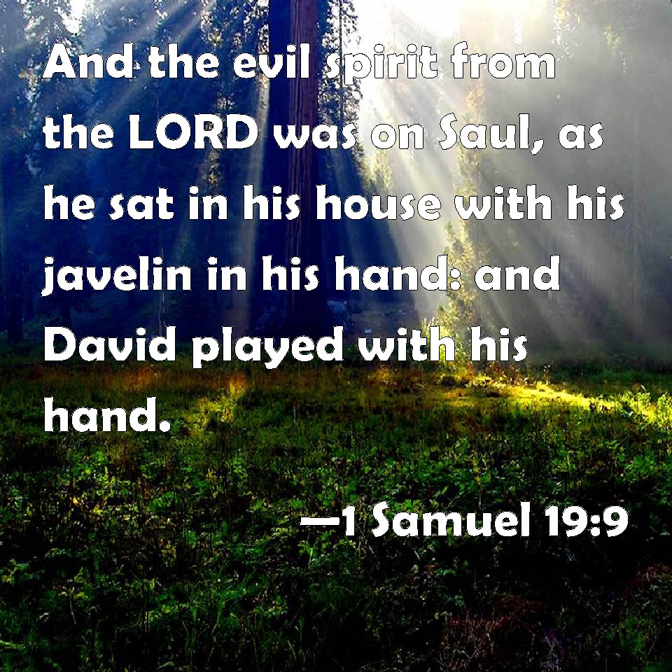 Choose a Background 1 Samuel 19:9 And the evil spirit from the LORD was on Saul, as he sat in his house with his javelin in his hand: and David played with his hand. KJV: And the evil spirit from the LORD was upon Saul, as he sat in his house with his javelin in his hand: and David played with his hand. DRB: And the evil spirit from the Lord came upon Saul, and he sat in his house, and held a spear in his hand: and David played with his hand. DBT: And an evil spirit from Jehovah was upon Saul. And he sat in his house with his spear in his hand; and David played with his hand. ERV: And an evil spirit from the LORD was upon Saul as he sat in his house with his spear in his hand; and David played with his hand. WBT: And the evil spirit from the LORD was upon Saul, as he sat in his house with his javelin in his hand: and David played with his hand. WEB: An evil spirit from Yahweh was on Saul, as he sat in his house with his spear in his hand; and David was playing with his hand. YLT: And a spirit of sadness from Jehovah is unto Saul, and he is sitting in his house, and his javelin in his hand, and David is playing with the hand,Links 1 Samuel 19:9 NIV • 1 Samuel 19:9 NLT • 1 Samuel 19:9 ESV • 1 Samuel 19:9 NASB • 1 Samuel 19:9 KJV • 1 Samuel 19:9 Interlinear • 1 Samuel 19:9 Commentaries • 1 Samuel 19:9 Parallel Texts • 1 Samuel 19:9 Bible Apps • 1 Samuel 19:9 Parallel • Bible Hub |