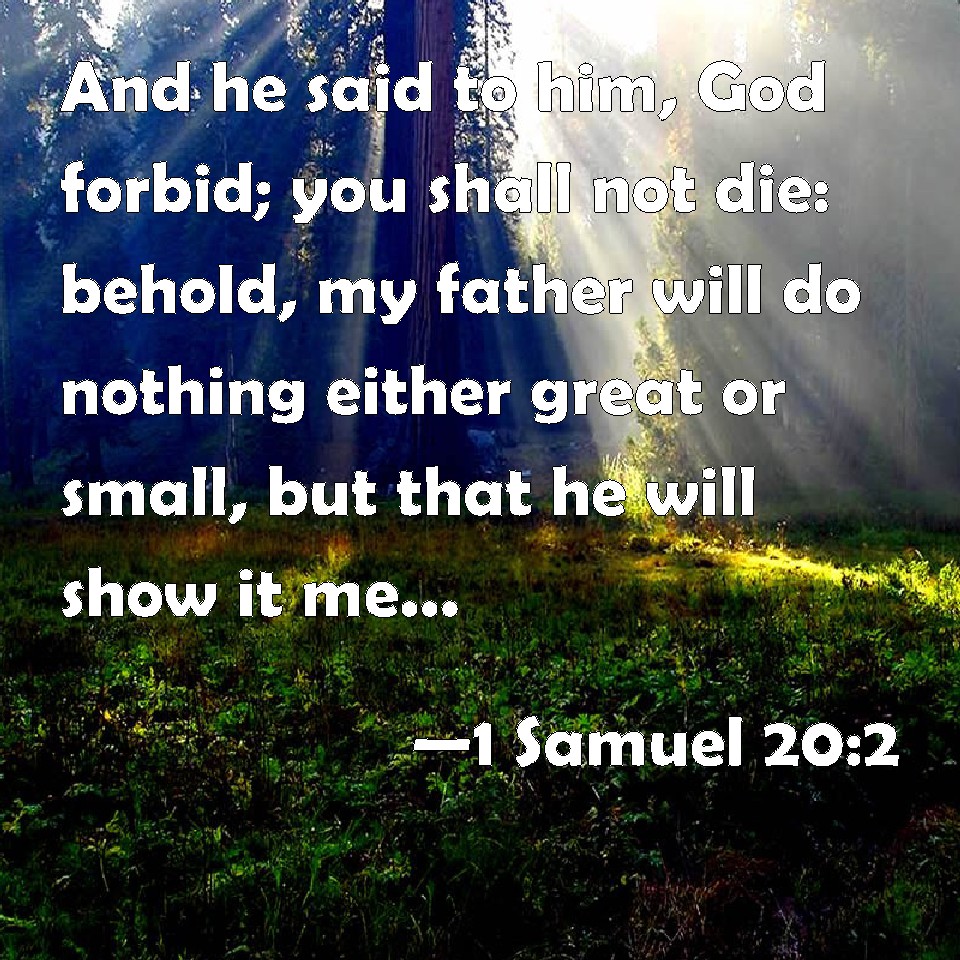 Choose a Background 1 Samuel 20:2 And he said to him, God forbid; you shall not die: behold, my father will do nothing either great or small, but that he will show it me: and why should my father hide this thing from me? it is not so. KJV: And he said unto him, God forbid; thou shalt not die: behold, my father will do nothing either great or small, but that he will shew it me: and why should my father hide this thing from me? it is not so. DRB: And he said to him: God forbid, thou shalt not die: for my father will do nothing great or little, without first telling me: hath then my father hid this word only from me? no, this shall not be. DBT: And he said to him, God forbid; thou shalt not die: behold, my father will do nothing either great or small, and not apprise me; and why should my father hide this thing from me? it is not so. ERV: And he said unto him, God forbid; thou shalt not die: behold, my father doeth nothing either great or small, but that he discloseth it unto me: and why should my father hide this thing from me? it is not so. WBT: And he said to him, Far be it from thee; thou shalt not die: behold, my father will do nothing, either great or small, but that he will show it to me: and why should my father hide this thing from me? it is not so. WEB: He said to him, "Far from it; you shall not die. Behold, my father does nothing either great or small, but that he discloses it to me; and why should my father hide this thing from me? It is not so." YLT: And he saith to him, 'Far be it! thou dost not die; lo, my father doth not do anything great or small and doth not uncover mine ear; and wherefore doth my father hide from me this thing? this thing is not.'Links 1 Samuel 20:2 NIV • 1 Samuel 20:2 NLT • 1 Samuel 20:2 ESV • 1 Samuel 20:2 NASB • 1 Samuel 20:2 KJV • 1 Samuel 20:2 Interlinear • 1 Samuel 20:2 Commentaries • 1 Samuel 20:2 Parallel Texts • 1 Samuel 20:2 Bible Apps • 1 Samuel 20:2 Parallel • Bible Hub |
