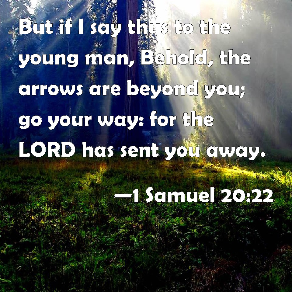 Choose a Background 1 Samuel 20:22 But if I say thus to the young man, Behold, the arrows are beyond you; go your way: for the LORD has sent you away. KJV: But if I say thus unto the young man, Behold, the arrows are beyond thee; go thy way: for the LORD hath sent thee away. DRB: If I shall say to the boy: Behold the arrows are on this side of thee, take them up: come thou to me, because, there is peace to thee, and there is no evil, as the Lord liveth. But if I shall speak thus to the boy: Behold the arrows are beyond thee: go in peace, for the Lord hath sent thee away. DBT: But if I say thus to the youth: Behold, the arrows are beyond thee, go thy way; for Jehovah sends thee away. ERV: But if I say thus unto the boy, Behold, the arrows are beyond thee: go thy way; for the LORD hath sent thee away. WBT: But if I say thus to the young man, Behold, the arrows are beyond thee; go thy way: for the LORD hath sent thee away. WEB: But if I say this to the boy, 'Behold, the arrows are beyond you;' then go your way; for Yahweh has sent you away. YLT: And if thus I say to the young man, Lo, the arrows are beyond thee, — go, for Jehovah hath sent thee away;Links 1 Samuel 20:22 NIV • 1 Samuel 20:22 NLT • 1 Samuel 20:22 ESV • 1 Samuel 20:22 NASB • 1 Samuel 20:22 KJV • 1 Samuel 20:22 Interlinear • 1 Samuel 20:22 Commentaries • 1 Samuel 20:22 Parallel Texts • 1 Samuel 20:22 Bible Apps • 1 Samuel 20:22 Parallel • Bible Hub |