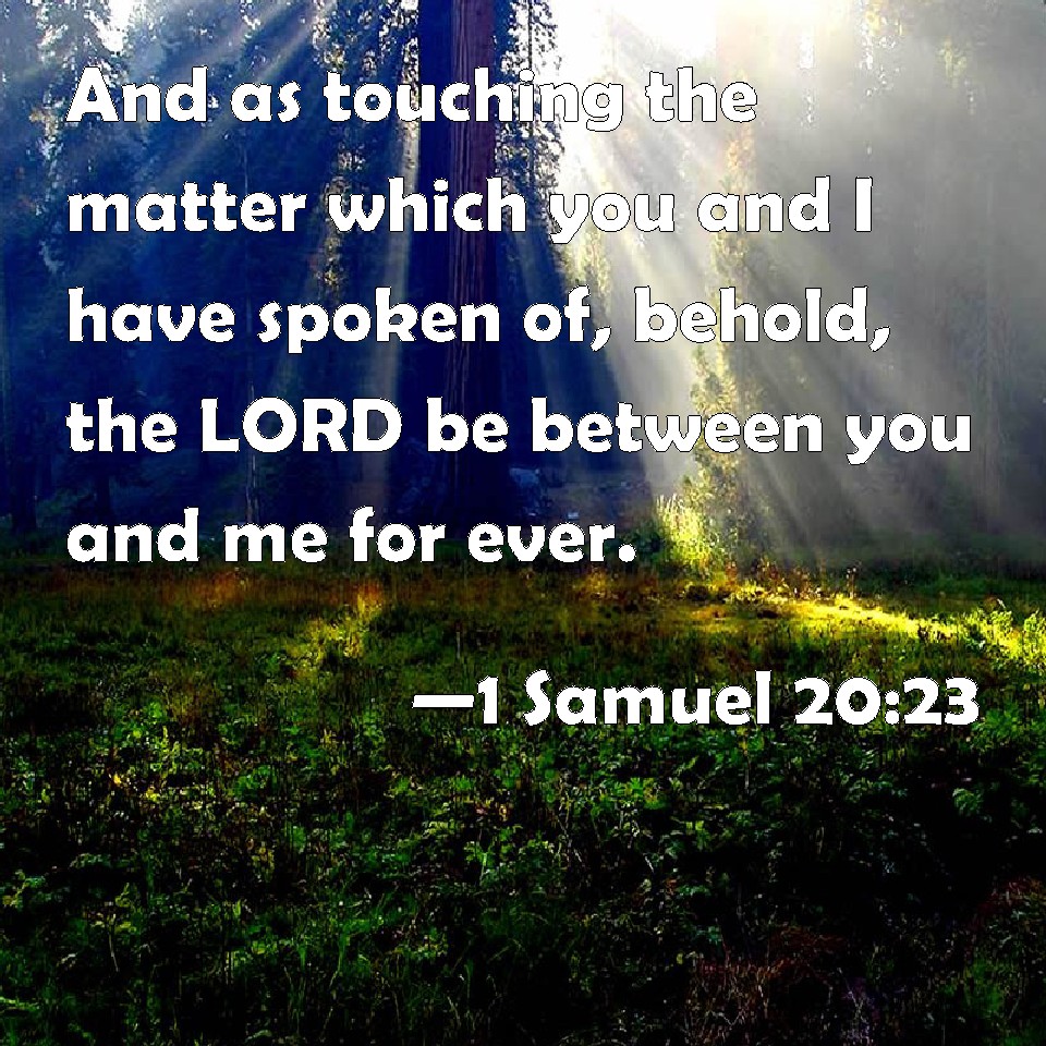 Choose a Background 1 Samuel 20:23 And as touching the matter which you and I have spoken of, behold, the LORD be between you and me for ever. KJV: And as touching the matter which thou and I have spoken of, behold, the LORD be between thee and me for ever. DRB: And concerning the word which I and thou have spoken, the Lord be between thee and me for ever. DBT: And as to the matter which thou and I have spoken of, behold, Jehovah is between me and thee for ever. ERV: And as touching the matter which thou and I have spoken of, behold, the LORD is between thee and me for ever. WBT: And as to the matter which thou and I have spoken of, behold, the LORD be between thee and me for ever. WEB: Concerning the matter which you and I have spoken of, behold, Yahweh is between you and me forever." YLT: as to the thing which we have spoken, I and thou, lo, Jehovah is between me and thee — unto the age.'Links 1 Samuel 20:23 NIV • 1 Samuel 20:23 NLT • 1 Samuel 20:23 ESV • 1 Samuel 20:23 NASB • 1 Samuel 20:23 KJV • 1 Samuel 20:23 Interlinear • 1 Samuel 20:23 Commentaries • 1 Samuel 20:23 Parallel Texts • 1 Samuel 20:23 Bible Apps • 1 Samuel 20:23 Parallel • Bible Hub |