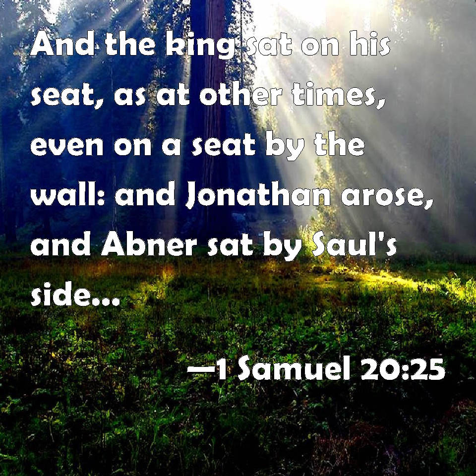 Choose a Background 1 Samuel 20:25 And the king sat on his seat, as at other times, even on a seat by the wall: and Jonathan arose, and Abner sat by Saul's side, and David's place was empty. KJV: And the king sat upon his seat, as at other times, even upon a seat by the wall: and Jonathan arose, and Abner sat by Saul's side, and David's place was empty. DRB: And when the king sat down upon his chair (according to custom) which was beside the wall, Jonathan arose, and Abner sat by Saul's side, and David's place appeared empty. DBT: And the king sat on his seat, as at other times, on the seat by the wall; and Jonathan arose, and Abner sat by Saul's side, and David's place was empty. ERV: And the king sat upon his seat, as at other times, even upon the seat by the wall; and Jonathan stood up, and Abner sat by Saul's side: but David's place was empty. WBT: And the king sat upon his seat, as at other times, even upon a seat by the wall: and Jonathan arose, and Abner sat by Saul's side, and David's place was empty. WEB: The king sat on his seat, as at other times, even on the seat by the wall; and Jonathan stood up, and Abner sat by Saul's side: but David's place was empty. YLT: and the king sitteth on his seat, as time by time, on a seat by the wall, and Jonathan riseth, and Abner sitteth at the side of Saul, and David's place is looked after.Links 1 Samuel 20:25 NIV • 1 Samuel 20:25 NLT • 1 Samuel 20:25 ESV • 1 Samuel 20:25 NASB • 1 Samuel 20:25 KJV • 1 Samuel 20:25 Interlinear • 1 Samuel 20:25 Commentaries • 1 Samuel 20:25 Parallel Texts • 1 Samuel 20:25 Bible Apps • 1 Samuel 20:25 Parallel • Bible Hub |
