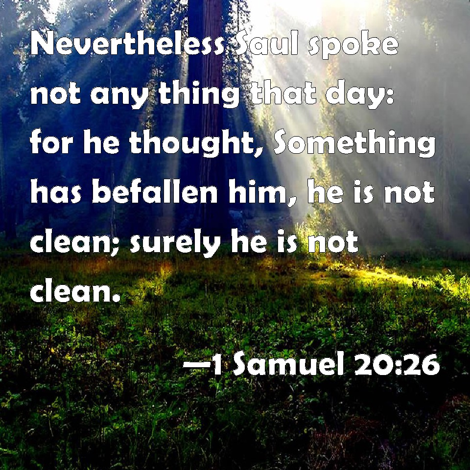 Choose a Background 1 Samuel 20:26 Nevertheless Saul spoke not any thing that day: for he thought, Something has befallen him, he is not clean; surely he is not clean. KJV: Nevertheless Saul spake not any thing that day: for he thought, Something hath befallen him, he is not clean; surely he is not clean. DRB: And Saul said nothing that day, for he thought it might have happened to him, that he was not clean, nor purified. DBT: And Saul said nothing that day; for he thought, Something has befallen him, that he is not clean: surely he is not clean. ERV: Nevertheless Saul spake not any thing that day: for he thought, Something hath befallen him, he is not clean; surely he is not clean. WBT: Nevertheless Saul spoke not any thing that day: for he thought, Something hath befallen him, he is not clean; surely he is not clean. WEB: Nevertheless Saul didn't say anything that day: for he thought, "Something has happened to him. He is not clean. Surely he is not clean." YLT: And Saul hath not spoken anything on that day, for he said, 'It is an accident; he is not clean — surely not clean.'Links 1 Samuel 20:26 NIV • 1 Samuel 20:26 NLT • 1 Samuel 20:26 ESV • 1 Samuel 20:26 NASB • 1 Samuel 20:26 KJV • 1 Samuel 20:26 Interlinear • 1 Samuel 20:26 Commentaries • 1 Samuel 20:26 Parallel Texts • 1 Samuel 20:26 Bible Apps • 1 Samuel 20:26 Parallel • Bible Hub |